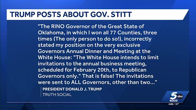 WASHINGTON (AP) — President Donald Trump attacked the Republican leader of the National Governors Association on Wednesday as tensions mounted between the White House and the bipartisan group of state leaders ahead of its annual meeting next week. In a social media post, Trump blasted Oklahoma Gov. Kevin Stitt, a Republican who chairs the NGA, as a “RINO,” meaning Republican in Name Only. Trump said Stitt “incorrectly stated my position on the very exclusive Governors Annual Dinner and Meeting at the White House.” The dispute centers on whether Trump would allow governors from both major parties to participate in the full range of White House events, which typically includes a business meeting and meal. In a letter to fellow governors on Monday, Stitt said the NGA was informed that the White House planned to limit invitations to the business meeting to Republicans. That prompted an outcry from Democrats, who said they wouldn't participate in the meal if they weren’t fully included at the business meeting. By Wednesday, Stitt connected with Trump on the phone and followed up with an email to fellow governors. “I am writing to inform you that President Donald J. Trump is inviting all governors of the 55 States and territories to the Friday, Feb. 20 NGA Business Breakfast at 8:30am est.,” Stitt wrote. “He was very clear in his communications with me that this is a National Governors Association’s event, and he looks forward to hosting you and hearing from governors across the country. President Donald Trump said this was always his intention, and we have addressed the misunderstanding in scheduling.” Trump, however, struck a far more adversarial tone in his social media post, calling Stitt's Monday letter “false.” “The invitations were sent to ALL Governors, other than two, who I feel are not worthy of being there,” he wrote, referring to Democratic Govs. Wes Moore of Maryland and Jared Polis of Colorado. Trump added: “I look forward to seeing the Republican Governors, and some of the Democrats Governors who were worthy of being invited, but most of whom won’t show up.” Following Trump's post, Brandon Tatum, the NGA's chief executive, stood by the group's timeline of events. “As of Tuesday evening, only Republican Governors received invites from the White House for the Friday morning business meeting,” he said in a statement. “We are hopeful that we can have constructive bipartisan dialogue with the President during the session. Continuing the tradition of the business meeting is an important step toward bridge building among parties.” For now, it's unclear how many Democrats will show up at the White House. Some, including Gov. Gavin Newsom of California, said Wednesday they didn't plan to attend the meeting. Others, such as Gov. Ned Lamont of Connecticut, signaled they would participate. White House press secretary Karoline Leavitt said Tuesday that Trump has “discretion to invite anyone he wants to the White House.” The spat is a reminder of the challenge facing bipartisan or nonpartisan organizations in Trump's Washington. The U.S. Conference of Mayors, which includes city leaders from both parties, met in Washington earlier this month but wasn't invited to the White House. The governor's meeting, typically a low-key event, took a sharper edge last year when Trump returned to the White House. The president singled out Maine Gov. Janet Mills, a Democrat, over his administration's effort to bar transgender athletes from competing in girls’ and women’s sports. He threatened to withhold federal funding from the state if she did not comply, prompting Mills to retort, “We’ll see you in court.” Trump predicted that Mills’ political career would be over for opposing the order, though she is now running for U.S. Senate on a staunch anti-Trump agenda. The back-and-forth had a lasting impact on last year’s conference and some Democratic governors did not renew their dues last year to the bipartisan group. ___ Associated Press journalists Tran Nguyen in Sacramento, California, and Susan Haigh in Hartford, Connecticut, contributed to this report