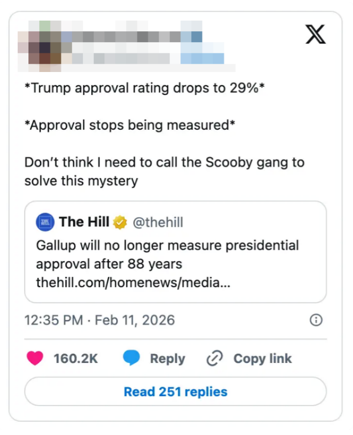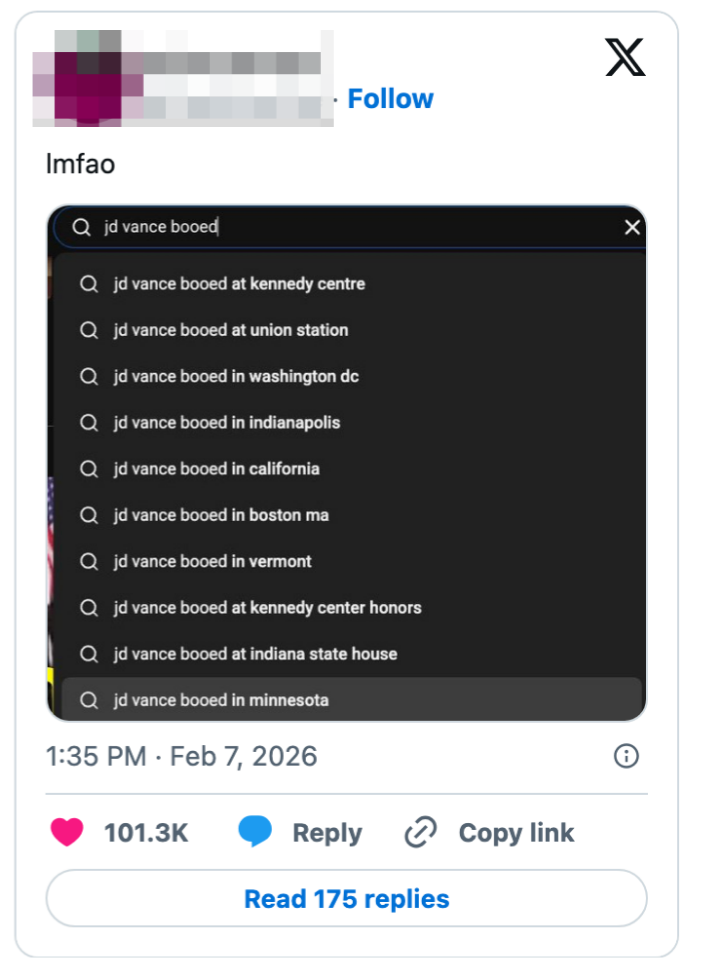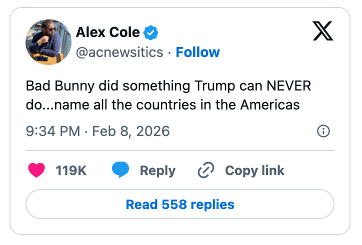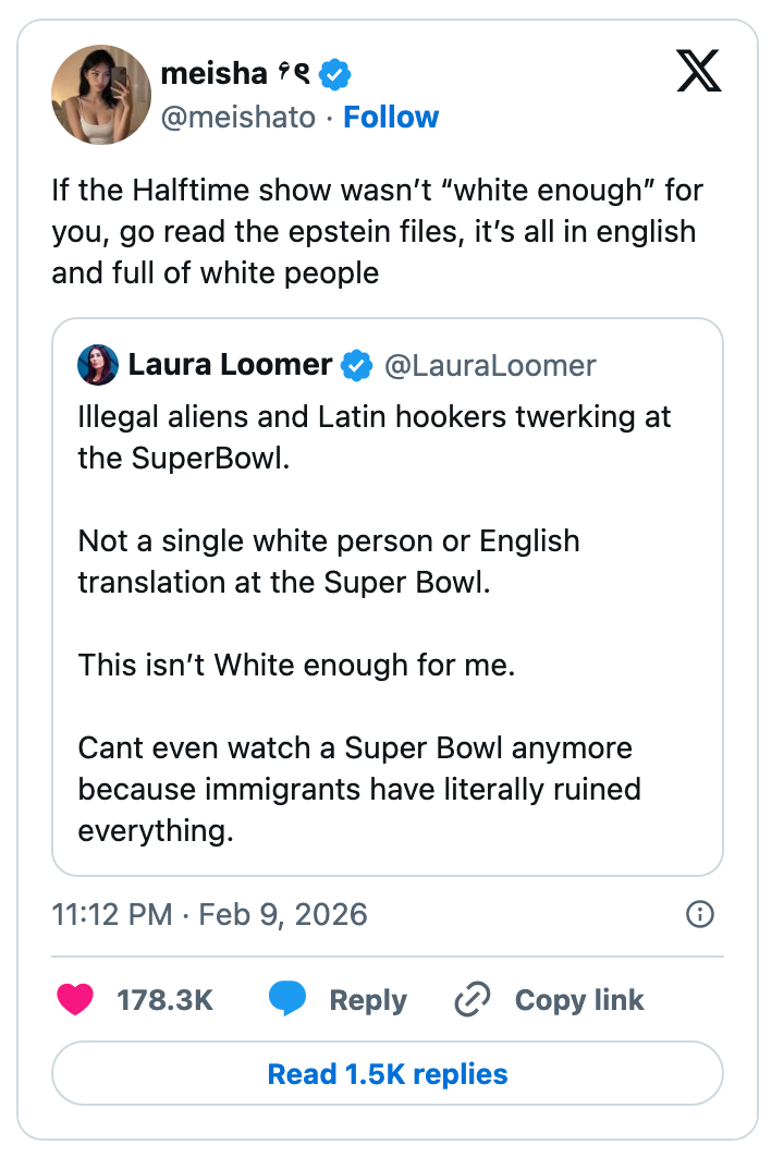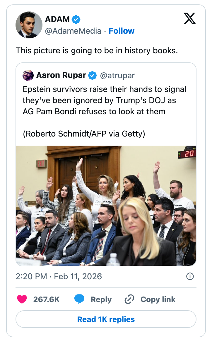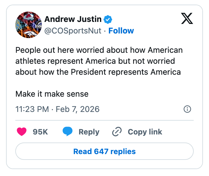 "People out here worried about how American athletes represent America but not worried about how the President represents America." Editor's Note: While we can't endorse what X has become, we can bring you the worthwhile moments that still exist there, curated and free of the surrounding chaos. The stock market is up so we don’t have to prosecute pedophiles is one of the worst political messages i have ever heard. https://t.co/Bjj7gPFYw6 The United States is one of the few world governments that does not directly fund it’s Olympic team. It is fully funded by corporate sponsorships and private donations.Which means our athletes don’t represent the American government.They represent the American people. https://t.co/BokJmTBqv9 lmfao no the fuck you are not https://t.co/eA1xGbjLxB Note: The image of Gus in the original tweet was replaced here due to photo rights. Note: The image in the original tweet was replaced here due to photo rights. Ladies and gentlemen our health secretary https://t.co/JqqNSnJN72 Note: The image of Epstein in the original tweet was replaced here due to photo rights. Watters: I was walking in my street, a car drives by and I give him a wave. He rolls down the window and says, “F U fascist.” He doesn’t know I’m a fascist!Jessica: Yes, he does. You’re on TV. pic.twitter.com/QIB4uOg6oj Note: The image of Jake in the original tweet was replaced here due to photo rights. Rep. Becca Balint: This is not a game, Secretary.Pam Bondi: I'm Attorney GeneralBalint: My apologies, I couldn't tell. pic.twitter.com/wY8GxHOEvl Note: The image in the original tweet was replaced here due to photo rights. same party that spent 15 years crying about participation trophies https://t.co/nFMeBA6hf3 Moskowitz: "Trump's name appears more times in the Epstein files than God's name appears in the book about God" pic.twitter.com/RyFb7MZIqg I was in Dollar General last week and bought a Snickers for $1.85. A year and a half ago it was $7 in the Airport https://t.co/DEJe5abuXL For more political tweets, check out our most recent roundup: "No One Even Knew Who The F—ck She Is": 29 Of The Very Best, Most Brutal, And Sometimes Funny Political Tweets Of The Week