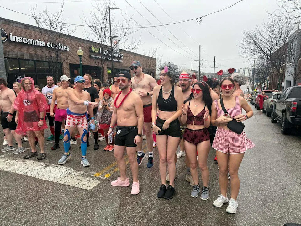 The miserable weather didn’t stop runners from participating in the annual Cupid’s Undie Run event Saturday, Feb. 14. In fact, at this event, discomfort was sort of the point. Since 2014, Kansas City has been one of the hosts to the event deemed “the pantless party with a purpose.” The run raises money for neurofibromatosis, commonly referred to as NF — a group of genetic disorders that causes skin pigmentation and tumors on nerve tissue. The event is organized by the Children’s Tumor Foundation, which supports research on NF. This year’s event started off with a Valentine’s Day-themed party at Q Kansas City, 504 Westport Road. It included an open bar, photo ops, and people dressed down to their underwear. Some of the run participants were dressed wearing just their underwear, socks and sneakers for the 50-degree, rainy weather. There was more socializing, drinking and dancing going on than stretching and preparing for a run. Many people didn’t care about the rain on Valentine’s Day. In fact, some of them walked in with only their briefs and shoes. On paper, this was a charity event that included exercising. In reality, the undie run was giving people something to laugh about and be silly with, all while doing it for a good cause. The point of dressing down is to show solidarity with those fighting NF, which impacts 1 in every 2,500 people. The race director for the Kansas City run, Layne Whitehouse, describes the moment as a way for people to relate with those fighting the disease. “The idea behind it all is people with NF are uncomfortable, so we can be uncomfortable to run a mile in whatever weather, in our underwear,” Whitehouse told The Star. “It’s very exposing. It’s uncomfortable, so we are trying to relate to them, but also having a lot of fun and fundraising for them.” Over 30 cities across the country have been participating in the run, with all of them happening around Valentine’s Day. A million dollars has been raised across the country, with the Kansas City run reeling in $22,000, according to Whitehouse. That’s a huge leap from last year’s $15,000 raised. Around 100 runners registered for the event, and many of them had different reasons to participate. Some did it for the sake of the cause, others did it as an excuse to be outside in their underwear. For Shawnee residents Lindsey and Hannah Dubey, the cause hits home, literally, as their 17-year-old son Eli has type two NF, schwannomatosis. Eli was diagnosed with NF at 5 years old, according to Lindsey. He said receiving news like that “stops your world.” He and the family had to adjust to Eli’s needs, while also educating themselves about NF awareness. “NF is so different for everybody, whether it’s type one, two or three. There are kids that are going through major medical battles, passing away at a young age,” Lindsey said. “We do everything that we can, especially my wife. She’s the champion for the cause.” Despite such a serious disease, Cupid’s Undie Run is a time for people to cut loose and have a fun time while supporting the cause. It’s almost like a mini-vacation for the Dubey parents, since they usually get a hotel near where the run is held. “It makes us feel awesome. Friends, family, community, that’s what it’s all about. It seems like there’s a lot younger people than us, so they think of it as a party,” he said. “But when they learn about it, they can pass that information on. And they realize that any money they’ve help to raise, goes to the cause. And what a good it goes to.” After about two hours of partying, it was time to run. It was a short one, though, just a mile long through a small part of the Westport neighborhood. Kansas City police assisted with blocking off parts of Westport Road so the runners could jog in peace. The first person back was Andrew Janesko, a Lawrence native who participated in last year’s run when it was in the Power & Light District, and wanted to run it back this year. “The charity aspect is great. I’m a runner, so I do marathons and stuff like that, but it’s fun to come out and do something nice and fun, easy for the big, great group of people, so I had a great time,” Janesko said following his run. If you didn’t participate in the run, but would like to donate to the cause, donations are being accepted on the Children’s Tumor Foundation website.