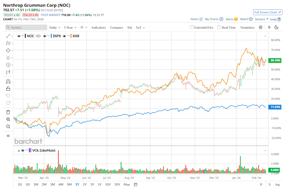 Valued at a market cap of $99.7 billion, Northrop Grumman Corporation (NOC) is an aerospace and defense technology company based in Falls Church, Virginia. This aerospace and defense company has considerably outpaced the broader market over the past 52 weeks. Shares of NOC have surged 54.4% over this time frame, while the broader S&P 500 Index ($SPX) has gained 11.8%. Moreover, on a YTD basis, the stock is up 23.2%, compared to SPX’s marginal downtick. AI Disruption Fear, FOMS and Other Key Things to Watch this Week Markets Don’t Bottom On Fear. They Bottom When Forced Sellers Are Done Dear Salesforce Stock Fans, Mark Your Calendars for February 25 Tired of missing midday reversals? The FREE Barchart Brief newsletter keeps you in the know. Sign up now! However, narrowing the focus, NOC has lagged behind the State Street SPDR S&P Aerospace & Defense ETF’s (XAR) 59.2% rise over the past 52 weeks. Nonetheless, it has outperformed XAR’s 12.2% YTD uptick. On Jan. 27, NOC shares soared 2.7% after it delivered stronger-than-expected Q4 results. Due to robust growth in revenue across all its reportable segments, the company’s net sales increased 9.6% year-over-year to $11.7 billion, surpassing consensus estimates by a slight margin. Moreover, due to a strong rise in its aeronautics, mission, and space systems operating income, its adjusted EPS reached $7.23, up 13.1% from the year-ago quarter and 3.3% ahead of analyst expectations. For fiscal 2026, ending in December, analysts expect NOC’s EPS to grow 6.5% year over year to $28.05. The company’s earnings surprise history is mixed. It exceeded the consensus estimates in three of the last four quarters, while missing on another occasion. Among the 22 analysts covering the stock, the consensus rating is a "Moderate Buy,” which is based on 11 “Strong Buy,” one “Moderate Buy,” and 10 "Hold” ratings. The configuration is less bullish than two months ago, with 12 analysts suggesting a “Strong Buy” rating. On Feb. 10, Argus maintained a "Buy" rating on NOC and raised its price target to $785, indicating an 11.7% potential upside from the current levels. The mean price target of $732.45 represents a 4.3% premium to its current price levels, while its Street-high price target of $815 suggests a 16% potential upside from the current levels. On the date of publication, Neharika Jain did not have (either directly or indirectly) positions in any of the securities mentioned in this article. All information and data in this article is solely for informational purposes. This article was originally published on Barchart.com