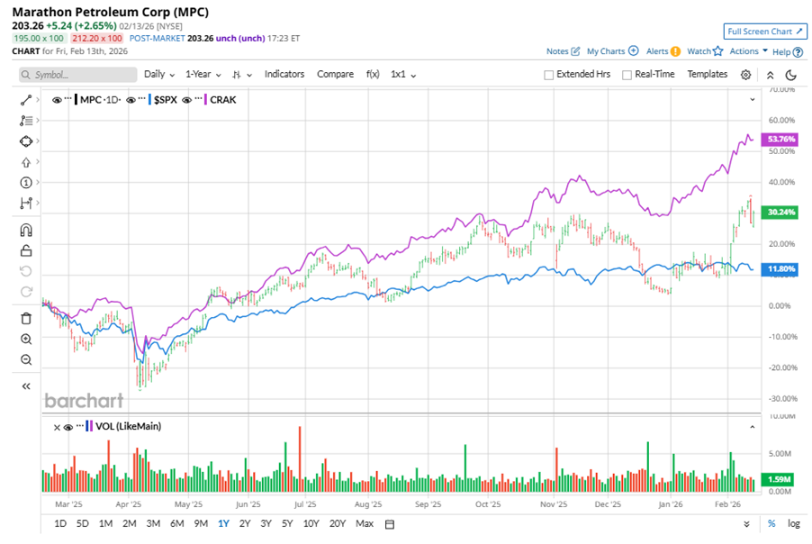 Marathon Petroleum Corporation (MPC), headquartered in Findlay, Ohio, functions as an integrated downstream energy company. Valued at $61.1 billion by market cap, the company refines, supplies, markets, and transports petroleum products. Shares of refining giant have outperformed the broader market over the past year. MPC has gained 31.9% over this time frame, while the broader S&P 500 Index ($SPX) has rallied nearly 11.8%. In 2026, MPC stock is up 25%, surpassing the SPX’s marginal fall on a YTD basis. What are Global Markets Watching Monday? Markets move fast. Keep up by reading our FREE midday Barchart Brief newsletter for exclusive charts, analysis, and headlines. Narrowing the focus, MPC’s underperformance is apparent compared to the VanEck Oil Refiners ETF (CRAK). The exchange-traded fund has gained about 55.4% over the past year. However, the stock’s gains on a YTD basis outshine the ETF’s 18.8% returns over the same time frame. On Feb. 3, MPC shares closed up more than 6% after reporting its Q4 results. Its adjusted EPS of $4.07 beat Wall Street expectations of $2.73. The company’s revenue stood at $33.4 billion, down marginally year over year. For the current fiscal year, ending in December, analysts expect MPC’s EPS to grow 24.4% to $13.31 on a diluted basis. The company’s earnings surprise history is mixed. It beat the consensus estimate in three of the last four quarters while missing the forecast on another occasion. Among the 19 analysts covering MPC stock, the consensus is a “Moderate Buy.” That’s based on eight “Strong Buy” ratings, three “Moderate Buys,” and eight “Holds.” This configuration is less bullish than a month ago, with nine analysts suggesting a “Strong Buy.” On Feb. 9, Citigroup Inc. (C) kept a “Neutral” rating on MPC and raised the price target to $210, implying a potential upside of 3.3% from current levels. While MPC currently trades above its mean price target of $201.94, the Street-high price target of $225 suggests an upside potential of 10.7%. On the date of publication, Neha Panjwani did not have (either directly or indirectly) positions in any of the securities mentioned in this article. All information and data in this article is solely for informational purposes. This article was originally published on Barchart.com