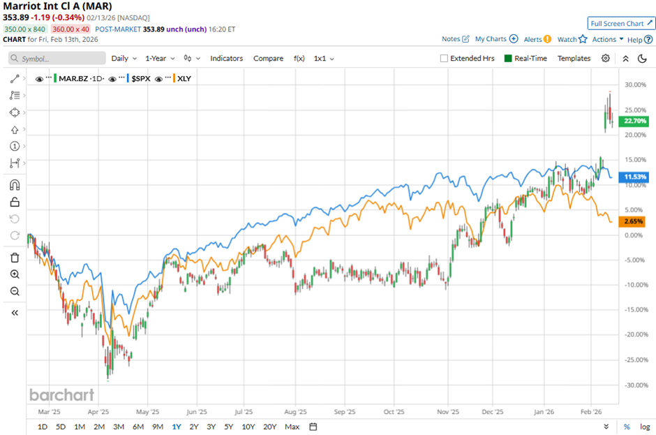 With a market cap of $93.8 billion, Marriott International, Inc. (MAR) is a global hospitality company engaged in the operation, franchising, and licensing of hotels, residential, timeshare, and lodging properties across the Americas, Europe, the Middle East & Africa, Greater China, and Asia Pacific. It operates a diverse portfolio of luxury, premium, and select-service brands, along with residences, timeshares, and yachts. Shares of the Bethesda, Maryland-based company have outperformed the broader market over the past 52 weeks. MAR stock has returned 22.8% over this time frame, while the broader S&P 500 Index ($SPX) has rallied 11.8%. Moreover, shares of the company are up 14.1% on a YTD basis, compared to SPX’s marginal decline. AI Disruption Fear, FOMS and Other Key Things to Watch this Week Markets Don’t Bottom On Fear. They Bottom When Forced Sellers Are Done Dear Salesforce Stock Fans, Mark Your Calendars for February 25 Markets move fast. Keep up by reading our FREE midday Barchart Brief newsletter for exclusive charts, analysis, and headlines. Focusing more closely, shares of the hotel company have outpaced the State Street Consumer Discretionary Select Sector SPDR ETF’s (XLY) 2.3% gain over the past 52 weeks. Despite reporting weaker-than-expected Q4 2025 adjusted EPS of $2.58, shares of MAR climbed 8.5% on Feb. 10 as the company posted revenue of $6.69 billion, exceeding Street forecasts. The rally was reinforced by strong operating momentum, including adjusted EBITDA of $1.40 billion, up 9% year-over-year, and an upbeat 2026 outlook calling for adjusted EPS of $11.32 - $11.57 and adjusted EBITDA growth of 8% - 10%. Investor confidence was further supported by expectations for worldwide RevPAR growth of 1.5% - 2.5% in 2026 and net rooms growth of 4.5% - 5%, underpinned by a record development pipeline of nearly 610,000 rooms. For the fiscal year ending in December 2026, analysts expect Marriott International’s adjusted EPS to grow 15.9% year-over-year to $11.61. The company's earnings surprise history is mixed. It beat the consensus estimates in three of the last four quarters while missing on another occasion. Among the 26 analysts covering the stock, the consensus rating is a “Moderate Buy.” That’s based on 10 “Strong Buy” ratings, two “Moderate Buys,” 13 “Holds,” and one “Strong Sell.” On Feb. 11, BMO Capital raised its price target on Marriott International to $400 and maintained an “Outperform” rating. As of writing, the stock is trading above the mean price target of $348.64. The Street-high price target of $420 implies a potential upside of 18.7% from the current price levels. On the date of publication, Sohini Mondal did not have (either directly or indirectly) positions in any of the securities mentioned in this article. All information and data in this article is solely for informational purposes. This article was originally published on Barchart.com
