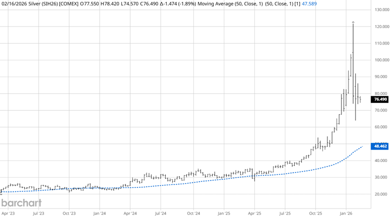 The silver market delivered a historic performance last year. The long-standing $50-per-ounce all-time high, first established in 1980 and briefly challenged in 2011, was decisively taken out as prices accelerated through successive resistance levels. The move culminated in a spike to $121.78 per ounce, a level few participants had projected at the start of the year. What began as a steady bull trend turned into a vertical advance during the final stages, drawing in momentum-driven capital and forcing systematic strategies to chase the price higher. As the rally intensified, speculative participation expanded rapidly. Open interest surged, and retail flows increased alongside leveraged fund exposure. In response to the growing volatility, the CME Group raised margin requirements multiple times, citing the need to ensure market integrity and guard against undercapitalized positions. Higher margin rates did little to cool enthusiasm in the short term, but they did increase the cost of holding leveraged longs at increasingly elevated price levels. The speed of the ascent, combined with expanding participation, created conditions typically associated with late-stage acceleration. Calm Waters for Alphabet (GOOG, GOOGL) Stock Present a Tempting Options Trade Amazon Put Options at Lower Strike Prices Have High Yields Option Volatility And Earnings Report For February 16 - 20 Get exclusive insights with the FREE Barchart Brief newsletter. Subscribe now for quick, incisive midday market analysis you won't find anywhere else. Markets rarely advance at that pace without eventually experiencing a meaningful correction. That does not imply the broader bull market in silver is finished. Structural demand drivers, monetary considerations, and investor allocation trends remain supportive over the intermediate term. However, after a move of this magnitude, the probability of a measurable retracement in the near future cannot be dismissed. Later in this article, we will examine the seasonal pattern, review years with similar correlated market behavior, and assess the current technical picture to frame the risk-reward profile from here. Source: Barchart Silver bulls certainly had their run! Going back 3 years, we can see that the weekly nearby silver chart has respected its 50-week simple moving average (SMA). Generally, when a runaway market gets this far from a popular mean, the natural tendency is to retrace towards it. Which is why I don’t believe the bull market has ended, yet. Many of our markets are undergoing similar trend transitions. And who can blame them? Their profits have been amazing. Is it possible that the unwinding of the Yen Carry Trade is impacting trading risk? Time will tell… Source: Moore Research Center, Inc. (MRCI) MRCI’s research on correlated market years alongside seasonal patterns significantly enhances the predictive power of seasonal trading by providing context for historical trends. Instead of relying on a simple, long-term average (which may mix bull and bear markets), this approach filters for years that behaved similarly to the current, ongoing market, resulting in higher-probability, more relevant trading signals. Currently, the July silver futures contract is experiencing a series of correlated years (green line), suggesting a significant downward move within 30 days. All four years have a correlation rate of >= 84%. The years are 1980 (95%), 1983 (87%), 2004 (92%), and 2006 (90%). There are also three years that “almost” made the team: 1974 (80%), 2008 (83%), and 2023 (80%). Source: MRCI MRCI seasonal research over 31 years, 15 years, and 5 years has shown the same significant price decline beginning after Valentine’s Day (February 14) and continuing through the end of February. Apparently, there is no love for silver after Valentine’s Day. By observation, the weekly chart shows silver extremely far above a popular mean. Currently, the silver market is trading similarly to the 4 correlated years, which has led to a significant move down, and the multi-year seasonal sell pattern ties this setup together. Traders and investors seeking a bullish position in the silver market can access several key assets, including silver futures contracts (e.g., COMEX standard size SI, micro-size SO), options on futures and equities are available as well, and silver ETFs like the iShares Silver Trust (SLV) or Physical Silver Shares ETF (SIVR), which track spot silver prices and offer liquid, cost-efficient exposure without direct metal storage. Last year’s decisive breakout above the $50 all-time high and the surge to $121.78 per ounce marked a historic moment for silver. Still, the speed of that advance, the spike in speculative participation, and repeated margin hikes by the CME Group are facts that seasoned traders cannot ignore. The weekly chart’s extended distance from its 50-week moving average, the high-correlation years pointing to potential downside pressure, and the well-documented post–Valentine’s Day seasonal weakness all argue for respect. None of this proves the bull market is over. It does, however, underscore that silver has earned its nickname as the “widow maker” for a reason. If you plan to participate—whether through futures, options, or ETFs—do the work. Study the seasonals, the correlations, the technical structure, and the macro backdrop. Opportunity is clearly present, but so is risk. In this market, discipline and position sizing matter just as much as conviction. On the date of publication, Don Dawson did not have (either directly or indirectly) positions in any of the securities mentioned in this article. All information and data in this article is solely for informational purposes. This article was originally published on Barchart.com