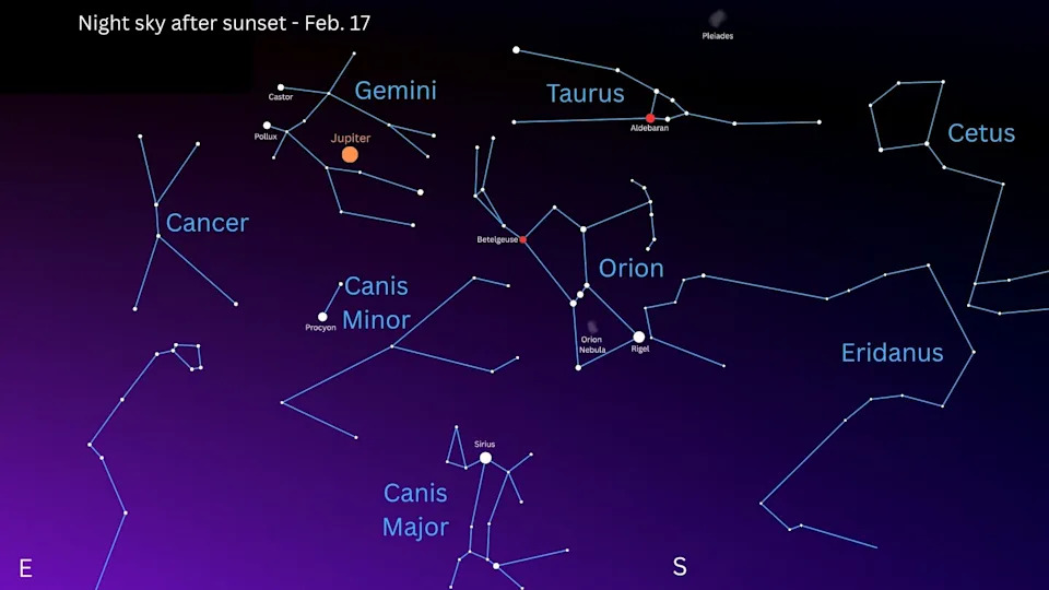 When you buy through links on our articles, Future and its syndication partners may earn a commission. The blissfully dark nights surrounding this month's new moon phase on Feb. 17 present a perfect opportunity to explore the wonders of the post-sunset realm while free of the glare cast by our natural satellite. A new moon phase occurs when the moon is positioned directly between the sun and Earth, meaning the moon isn't visible at night and is hidden by the sun's glare during the day. February's new moon phase occurred at 7:01 a.m. EST (1201 GMT), heralding the onset of a spectacular annular solar eclipse visible across a swathe of Antarctica, as the lunar disk passed in front of the sun, leaving only the "ring of fire" of its outer edge on display. Sadly, unless you're a penguin or an Antarctic researcher, you were unlikely to catch the eclipse for yourself today. Still, the new moon offers several nights of pristinely dark moonless skies, so grab your telescope and join us on a sightseeing tour of the mid-February night sky. Mercury will shine low in the west in the hour following sunset on Feb. 17, appearing as a bright "evening star" less than 20 degrees above the horizon. If you're incredibly lucky β and have a clear view of the western horizon β then you may be able to spot the steady light of Venus vying for attention in the glow of the setting sun below Mercury on Feb. 17, before it follows our parent star swiftly out of sight. Saturn will be visible less than 15 degrees to the upper left of Mercury. Its iconic rings are finally starting to reveal themselves after seeming to "disappear" in November last year, when they turned edge-on in relation to Earth, making them appear as little more than a thin line. Dark nights around the new moon phase are the perfect time to hunt twinkling constellations through the winter sky. Look to the left of Jupiter to find Castor and Pollux β the two stars that represent the twins in the constellation Gemini. The gleaming star directly below Jupiter in the evening sky is Procyon, the brightest member of the constellation Canis Minor, the little dog. Sirius, the brightest star in the night sky, sits at the heart of Canis Majoris β the big dog β and can be found shining roughly 20 degrees to its lower right (roughly the width of two stacked fists held at arm's length), with the stars Wezen and blue Adhara forming its rear leg. Both stellar hounds hunt the night sky alongside their master, the hunter depicted in the constellation Orion, the colorful stars of which can be spotted to the upper right of Sirius in the hours following sunset on Feb. 17. Look out for the red giant star Betelgeuse, which marks the right shoulder of Orion and the blue supergiant Rigel, which marks the left foot. Between are the three familiar points of Orion's Belt, and hanging below that is the milky light of the Orion Nebula β a colossal stellar nursery that orbits within the Milky Way roughly 1,500 light-years from Earth. To the right of Orion will be the red light of Aldebaran, the star which marks the eye of the great bull in the constellation Taurus. Notice a hazy patch of light to the upper right of Aldebaran? That's the Pleiades, a vast star cluster teeming with over a thousand blue-white stars, which makes for a magnificent target, whether you're viewing with the naked eye, binoculars, or a telescope. Next, look to the northeast to find the seven stars of the "Big Dipper" asterism standing on its end close to the horizon. Locate the two uppermost stars β Merak and Dubhe β and draw an imaginary line from the former through the latter and out into space. The next bright star you find will be Polaris, the "North Star", around which the entire sky appears to revolve. Continue following that line and look slightly higher to find the five bright stars of Cassiopeia, arrayed in a zig-zagging formation reminiscent of a sideways "W", or "M", which is said to portray a queen who was cast into the stars after falling foul of the Greek god Poseidon. Want to get a closer look at the night sky? Then be sure to check out our picks of the top binoculars and telescopes for exploring the planets and constellations, while photographers should read our selection of the best cameras and lenses for astrophotography. Editor's Note: If you would like to share your astrophotography with Space.com's readers, then please send your photo(s), comments, name and location to spacephotos@space.com.