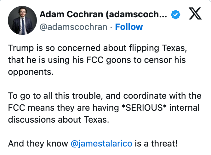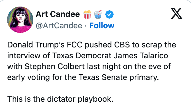 In broadcast TV, the "equal time rule" requires networks to offer opposing candidates an equal amount of airtime. It's important to note that Carr has previously been less strict when it comes to talk radio. The same rules apply, yet Carr reportedly said he doesn't see a reason to inflict warnings on the medium popularly used by conservative voices. Notably, CBS has denied barring the Late Show from airing the interview. “The show was provided legal guidance that the broadcast could trigger the FCC equal-time rule for two other candidates, including Rep. Jasmine Crockett, and presented options for how the equal time for other candidates could be fulfilled,” CBS told Variety in a statement. This is the interview Donald Trump didn’t want you to see.His FCC refused to air my interview with Stephen Colbert.Trump is worried we’re about to flip Texas. pic.twitter.com/BCev5jZbKc Share your thoughts on the situation in the comments.