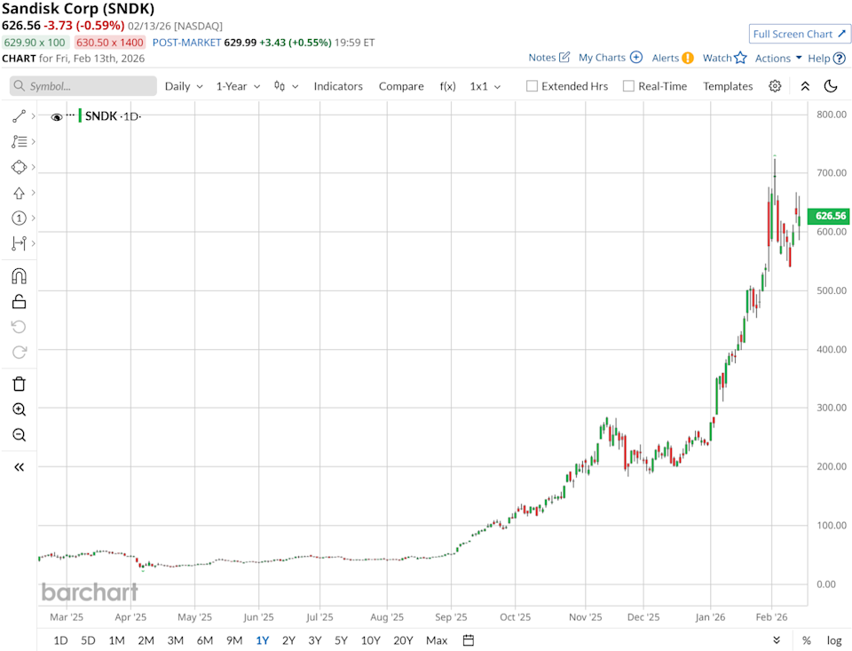 Kioxia (KXIAY), the Japanese memory giant that delivered a staggering 540% gain in 2025 as the best-performing stock in the world, just made another big call. On Feb. 11, Kioxia forecast sharply higher demand for NAND memory chips, quickly lifting sentiment across the memory sector. Sandisk (SNDK) jumped more than 8% the same day, pushing AI infrastructure names higher as investors took the news as a sign that demand for data storage remains strong. The reason is pretty straightforward. Many memory analysts now expect demand to stay ahead of supply well into 2026 and beyond, and that backdrop has already helped SNDK shares rise more than 1200% over the past six months. Kioxia’s latest outlook fits right into that view, and it matters even more because the two companies are closely linked. Cathie Wood Adds 210K Shares to a Rising AI Bet With Upside of 102% Is GOOG Stock a Buy Amid the Software Selloff? Broadcom Is ‘Sitting on a Sinking Iceberg.’ Why 1 Analyst Is Warning on AVGO Stock Here. Our exclusive Barchart Brief newsletter is your FREE midday guide to what's moving stocks, sectors, and investor sentiment - delivered right when you need the info most. Subscribe today! In January 2026, Kioxia and Sandisk extended their joint venture (JV) at the Yokkaichi and Kitakami flash memory plants through 2034, keeping their focus on AI-enabled smart manufacturing of advanced 3D NAND. In other words, when Kioxia’s outlook improves, it often points to the kind of market conditions that Sandisk can benefit from, too. Still, even with all that momentum, Sandisk is currently about 17% below its recent high of $725, which puts the spotlight on timing. With Kioxia’s outlook adding fresh energy to the memory trade, is the pullback in Sandisk a buying opportunity? Or a warning that the easy gains are already behind us? Let’s find out. Sandisk is a pure‑play flash memory and storage manufacturer selling NAND chips and SSD solutions for data centers, devices, and broader AI infrastructure. Over the past 12 months, SNDK stock has gone from a lightly followed memory cyclical to a clear market favorite, climbing roughly 1,180% in 52 weeks and about 154% year-to-date (YTD). That run-up has pulled the valuation higher, too. Sandisk now trades at a forward price‑to‑earnings (P/E) multiple of about 27.3 times, which is noticeably above the sector median of roughly 23 times. That suggests investors are paying extra for what they believe is multi‑year, AI‑driven earnings growth. The latest fiscal second‑quarter results show why the market has stayed positive. Revenue came in at about $3.02 billion, up 31% sequentially and above guidance. GAAP net income reached roughly $803 million, translating to $5.15 in diluted EPS. Non‑GAAP EPS was $6.20, pointing to real margin improvement as AI data center demand lifts pricing and keeps factories running fuller. Data-center revenue alone jumped 64% sequentially, driven by hyperscalers, semi‑custom wins, and large technology customers rolling out AI at scale. Kioxia and Sandisk turning on Fab2 in Kitakami is one of the most direct reasons the story looks stronger. The new facility can produce eighth‑generation, 218‑layer 3D flash using CBA technology, and it is built specifically to meet AI-driven storage demand. Capacity will ramp in stages, with meaningful output anticipated in the first half of 2026. The plant also includes an earthquake‑absorbing design, energy‑saving equipment, AI‑supported efficiency improvements, and a space‑efficient clean‑room layout, with part of the investment subsidized by the Japanese government. That helps Sandisk scale advanced NAND with better economics. That capacity story ties into longer-term supply stability. Kioxia and Sandisk extended their Yokkaichi JV agreement through 2034, building on more than 25 years of collaboration, and they aligned the Kitakami JV to the same timeline. The goal is stable production of advanced 3D flash for AI workloads, and it also creates a clear cash commitment, since Sandisk will pay Kioxia $1.16 billion for manufacturing services and continued supply from 2026 to 2029. On top of that, Sandisk is also pushing into new standards. Its memorandum of understanding (MOU) with SK Hynix to co‑define High Bandwidth Flash is aimed at standardizing a new memory class designed for AI inference, including the specs and ecosystem groundwork. So, Sandisk is not only supplying into the AI memory cycle but also helping shape where the technology goes next. For the current fiscal third quarter, management is guiding for revenue between $4.4 billion and $4.8 billion, with non‑GAAP diluted EPS expected in a wide but still eye-catching $12 to $14 range. On the Street’s side, the average earnings estimate is $5.55 for the current quarter, $8.35 for the next period, and $22.96 for fiscal 2026, which points to year-over-year (YOY) growth rates of roughly 1,025%, 41,650%, and 1,189%, respectively. Those numbers help explain why analysts are still mostly positive, even after a huge run. Morgan Stanley analyst Joseph Moore recently reiterated a “Buy” rating and raised his price target to $690, which suggests 15% potential upside from current levels. Cantor Fitzgerald analyst Christopher Muse was much more aggressive. Muse believes NAND prices could rise another 50% in Sandisk’s fiscal Q3, pushing gross margin toward about 67% and supporting a high $800 price target by the end of 2026. Overall, 21 analysts with coverage rate SNDK stock as a consensus “Moderate Buy." The average price target of $659.76 implies roughly 10% potential upside from here. In the near term, Sandisk still looks buyable here, but it is no longer a blunt “set it and forget it” memory trade. The Kioxia‑driven tight‑supply story, Fab2 ramp, and High Bandwidth Flash roadmap all argue that earnings and margins can keep surprising to the upside, which supports SNDK stock grinding higher rather than colla