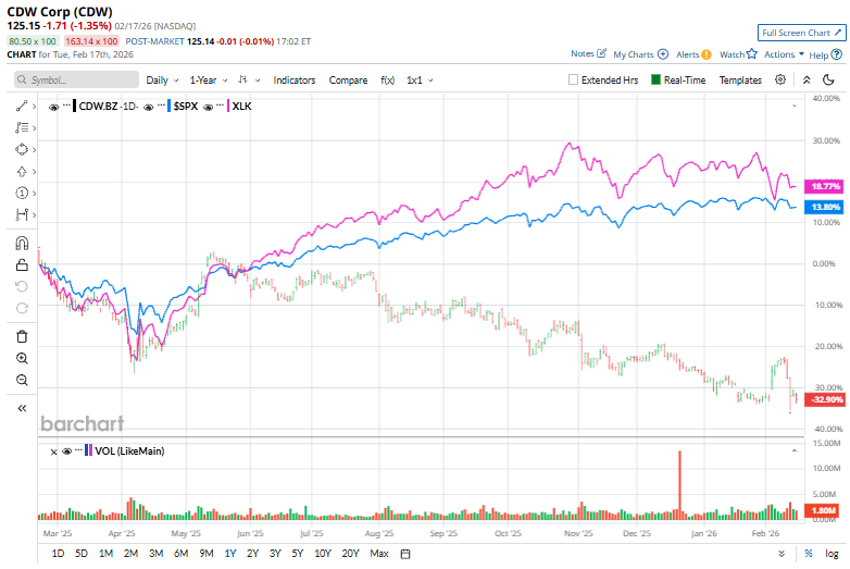 Valued at a market cap of $16.5 billion, CDW Corporation (CDW) is a leading North American IT solutions provider that helps organizations design, procure, implement, and manage technology infrastructure. Headquartered in Vernon Hills, Illinois, the company serves enterprise, small-business, and public-sector customers (government, education, healthcare) across the U.S., U.K., and Canada. Shares of the tech company have lagged behind the broader market over the past 52 weeks. CDW stock has slumped 33.9% over this time frame, while the broader S&P 500 Index ($SPX) has risen 11.9%. Moreover, shares of CDW have dropped 8.1% on a YTD basis, compared to SPX's marginal fall. Cathie Wood Adds 210K Shares to a Rising AI Bet With Upside of 102% Is GOOG Stock a Buy Amid the Software Selloff? Broadcom Is ‘Sitting on a Sinking Iceberg.’ Why 1 Analyst Is Warning on AVGO Stock Here. Tired of missing midday reversals? The FREE Barchart Brief newsletter keeps you in the know. Sign up now! Looking more closely, CDW stock has underperformed the State Street Technology Select Sector SPDR Fund's (XLK) 16.3% increase over the past 52 weeks and a 3.1% drop on a YTD basis. On Feb. 4, CDW shares surged 9.5% after the company reported stronger-than-expected Q4 2025 results that underscored resilient enterprise IT spending. Its revenue rose 6% year over year to $5.5 billion, while non-GAAP EPS of $2.57 topped consensus forecasts, supported by robust demand for cloud, software, and services solutions across corporate and public-sector customers. Gross profit grew faster than sales, with margin expanding to 22.8% as the mix continued shifting toward higher-value offerings. Although operating margins were slightly pressured by higher SG&A investment, the overall earnings beat and healthy solution-led growth trajectory drove a sharp positive market reaction. For the fiscal year ending in December 2026, analysts expect CDW's EPS to rise 4.3% year-over-year to $9.94. The company's earnings surprise history is promising. It beat the consensus estimates in the last four quarters. Among the 12 analysts covering the stock, the consensus rating is a “Moderate Buy.” That’s based on six “Strong Buy” and six “Holds.” The current consensus is bullish than three months ago when the stock had five “Strong Buy” suggestions. On Feb. 5, Citigroup analyst Asiya Merchant maintained a “Neutral” rating on CDW and modestly raised the price target to $150 from $148. The mean price target of $170.40 represents a 30.2% premium to CDW’s current price levels. The Street-high price target of $225 suggests a 60.9% potential upside. On the date of publication, Kritika Sarmah did not have (either directly or indirectly) positions in any of the securities mentioned in this article. All information and data in this article is solely for informational purposes. This article was originally published on Barchart.com