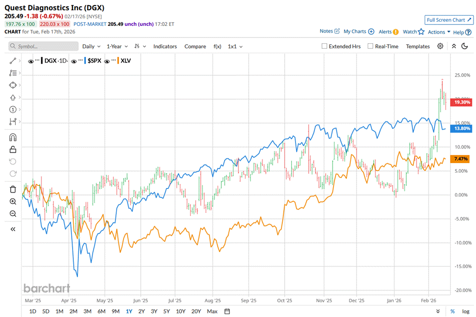 Secaucus, New Jersey-based Quest Diagnostics Incorporated (DGX) provides diagnostic testing and services in the United States and internationally. Valued at a market capitalization of $23 billion, the company develops and delivers diagnostic information services, including routine, non-routine, and advanced clinical testing, anatomic pathology testing, and other diagnostic services. The company's shares have outperformed the broader market over the past year and in 2026. DGX stock has surged 21.8% over the past 52 weeks and 18.4% on a YTD basis. In comparison, the S&P 500 Index ($SPX) has returned 11.9% over the past year and declined marginally in 2026. Cathie Wood Adds 210K Shares to a Rising AI Bet With Upside of 102% Is GOOG Stock a Buy Amid the Software Selloff? Broadcom Is ‘Sitting on a Sinking Iceberg.’ Why 1 Analyst Is Warning on AVGO Stock Here. Get exclusive insights with the FREE Barchart Brief newsletter. Subscribe now for quick, incisive midday market analysis you won't find anywhere else. Narrowing the focus, DGX has also outperformed the State Street Healthcare Select Sector SPDR ETF’s (XLV) 8.7% rise over the past 52 weeks. On Feb. 10, Quest Diagnostics' shares surged 7.4% following the release of its better-than-expected Q4 2025 earnings. The company’s revenue amounted to $2.81 billion in the period, topping Street forecasts. Moreover, its adjusted EPS came in at $2.18, also surpassing Wall Street's projections. Investor confidence got an extra boost when management raised its full-year forecast. The management now expects its revenues to be between $10.8 billion and $10.9 billion, and adjusted EPS to be in the range of $9.63 to $9.83. For the current year ending in December 2026, analysts expect Quest Diagnostics' EPS to grow 7.7% YoY to $10.61 on a diluted basis. The company’s earnings surprise history is strong. It surpassed the consensus estimate in all four quarters. Among the 18 analysts covering DGX stock, the consensus is a “Moderate Buy.” That’s based on nine “Strong Buy” ratings and nine “Holds.” The configuration has become slightly more bullish in recent months, with the stock now carrying nine “Strong Buy” ratings, up from eight just a month ago. On Feb.12, Mizuho analyst Ann Hynes maintained an "Outperform" rating on Quest Diagnostics and raised the price target from $210 to $235. The mean price target of $216 indicates a 5.1% premium to DGX’s current price levels. Its Street-high target of $235 suggests a massive 14.4% potential upside. On the date of publication, Sristi Jayaswal did not have (either directly or indirectly) positions in any of the securities mentioned in this article. All information and data in this article is solely for informational purposes. This article was originally published on Barchart.com