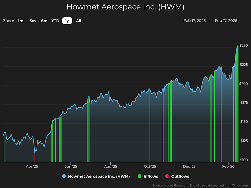 Howmet develops and manufactures metal products for the aerospace and defense industries, including engines, fasteners, engineered structures, and forged wheels that end up on airplanes, trucks, and more around the world. Its engines are even being used for AI data center backup power. HWM’s fourth-quarter fiscal 2025 report showed $2.17 billion in quarterly revenue (a 15% year-over-year jump), quarterly per-share earnings of $1.05 (a 42% gain), and full-year EPS of $3.77 (a 40% rise). It’s no wonder HWM shares are up 23% this year – and they could rise more. MoneyFlows data shows how Big Money investors are betting heavily on the forward picture of the stock. Institutional volumes reveal plenty. In the last year, HWM has enjoyed strong investor demand, which we believe to be institutional support. Each green bar signals unusually large volumes in HWM shares. They reflect our proprietary inflow signal, pushing the stock higher: Plenty of industrials names are under accumulation right now. But there’s a powerful fundamental story happening with Howmet. Institutional support and a healthy fundamental backdrop make this company worth investigating. As you can see, HWM has had strong sales and earnings growth: 3-year sales growth rate (+13.4%) 3-year EPS growth rate (+49.8%) Source: FactSet Also, EPS is estimated to ramp higher this year by +20.5%. Now it makes sense why the stock has been powering to new heights. HWM has a track record of strong financial performance. Marrying great fundamentals with our proprietary software has found some big winning stocks over the long term. Howmet has been a top-rated stock at MoneyFlows. That means the stock has unusual buy pressure and growing fundamentals. We have a ranking process that showcases stocks like this on a weekly basis. It’s made the rare Outlier 20 report nine times in the last year and is up 218% since Big Money first bought big in 2024. The blue bar below shows when HWM was a top pick…Big Money keeps buying: Tracking unusual volumes reveals the power of money flows. This is a trait that most outlier stocks exhibit…the best of the best. Big Money demand drives stocks upward. The HWM rally isn’t new at all. Big Money buying in the shares is signaling to take notice. Given the historical gains in share price and strong fundamentals, this stock could be worth a spot in a diversified portfolio. Disclosure: the author holds no position in HWM at the time of publication. If you are a Registered Investment Advisor (RIA) or are a serious investor, take your investing to the next level and follow our free weekly MoneyFlows insights. This article was originally posted on FX Empire Bitcoin (BTC/USD): Cycle Analysis Update Walmart Earnings Preview: Can WMT Reach a New All-Time High? (Part One) Sterling Declines as the BoE Appears More Dovish See DHT Holdings Rise with Institutional Inflows Top AI Stocks Have Room to Run Watch Woodward Soar on Huge Inflows