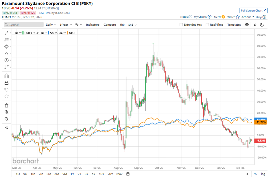 With a market cap of $11.9 billion, Paramount Skydance Corporation (PSKY) is a global media and entertainment company operating across Studios, Direct-to-Consumer, and TV Media segments, with a broad portfolio spanning broadcast television, cable networks, streaming platforms, and film production. It produces, distributes, and licenses content worldwide through well-known brands, studios, and digital platforms across theatrical, television, and streaming markets. Shares of the New York-based company have underperformed the broader market over the past 52 weeks. PSKY stock has decreased 4.4% over this time frame, while the broader S&P 500 Index ($SPX) has rallied 11.6%. Moreover, shares of the company are down 18.4% on a YTD basis, compared to SPX’s marginal rise. Has Palantir Bottomed? Probably, Based on Huge, Unusual Put Options Activity in PLTR SoftBank Just Sold $3.6 Billion Worth of Nvidia Stock. Should You Ditch NVDA Too? QQQ Just Sent a Chilling Signal — Right Before Nvidia Earnings Markets move fast. Keep up by reading our FREE midday Barchart Brief newsletter for exclusive charts, analysis, and headlines. Looking closer, shares of Paramount Skydance have lagged behind the State Street Communication Services Select Sector SPDR ETF’s (XLC) 9.9% return over the past 52 weeks. Shares of Paramount Skydance climbed 9.8% following its Q3 2025 results on Nov. 10 as investors reacted positively to management’s growth outlook, including a $30 billion total revenue target for 2026 and adjusted OIBDA guidance of $3.5 billion. The rally was also driven by plans to invest over $1.5 billion in incremental programming across theatrical and direct-to-consumer platforms and to expand theatrical output to at least 15 films per year starting in 2026, signaling confidence in content-led growth. Additionally, strong D2C momentum - 1.4 million net subscriber adds in Q3, bringing Paramount+ to 79 million subscribers, alongside a higher run-rate efficiency target raised to at least $3 billion. For the fiscal year that ended in December 2025, analysts expect PSKY's EPS to decline 58.4% year-over-year to $0.64. The company's earnings surprise history is mixed. It beat the consensus estimates in three of the last four quarters while missing on another occasion. Among the 18 analysts covering the stock, the consensus rating is a “Hold.” That’s based on one “Strong Buy” rating, 13 “Holds,” and four “Strong Sells.” On Jan. 23, Laurent Yoon of Bernstein maintained a “Sell” rating on Paramount Skydance, setting a price target of $12. The mean price target of $14.42 represents a premium of 31.6% to PSKY's current levels. The Street-high price target of $19 implies a potential upside of 73.4% from the current price levels. On the date of publication, Sohini Mondal did not have (either directly or indirectly) positions in any of the securities mentioned in this article. All information and data in this article is solely for informational purposes. This article was originally published on Barchart.com