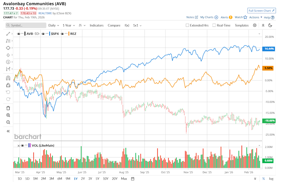 Arlington, Virginia-based AvalonBay Communities, Inc. (AVB) is a Real Estate Investment Trust (REIT) that owns, develops, redevelops, acquires and manages high-quality multifamily apartment communities. It is valued at a market cap of $25.2 billion. This residential REIT has trailed behind the broader market over the past 52 weeks. Shares of AVB have declined 18.3% over this time frame, while the broader S&P 500 Index ($SPX) has gained 12.3%. Moreover, on a YTD basis, the stock is down 1.8%, while SPX has risen marginally. Has Palantir Bottomed? Probably, Based on Huge, Unusual Put Options Activity in PLTR SoftBank Just Sold $3.6 Billion Worth of Nvidia Stock. Should You Ditch NVDA Too? Rackspace Stock Is Soaring on a Palantir Partnership. Should You Chase RXT Shares Here? Tired of missing midday reversals? The FREE Barchart Brief newsletter keeps you in the know. Sign up now! Narrowing the focus, AVB has also underperformed the iShares Residential and Multisector Real Estate ETF (REZ), which gained 5.4% over the past 52 weeks and 7.6% on a YTD basis. On Feb. 4, AVB reported its Q4 results, and its shares plunged 4.6% in the following trading session. The company’s core FFO per share improved 1.8% year-over-year to $2.85, surpassing consensus estimates by a penny. Additionally, its same-store residential revenue advanced 1.8% from the year-ago quarter to $680.5 million, while its same-store residential NOI increased 1.3%, reaching $467.1 million. For fiscal 2026, ending in December, analysts expect AVB’s FFO per share to remain stable at $11.24 compared to the year-ago quarter. The company’s FFO surprise history is mixed. It topped consensus estimates in three of the last four quarters, while missing in the other quarter. Among the 23 analysts covering the stock, the consensus rating is a "Moderate Buy,” which is based on six “Strong Buy,” one "Moderate Buy,” and 16 "Hold” ratings. The configuration is less bullish than a month ago, with seven analysts suggesting a “Strong Buy” rating. On Feb. 13, Citigroup Inc. (C) analyst Nicholas Joseph maintained a "Neutral" rating on AVB but lowered its price target to $198, indicating an 11.6% potential upside from the current levels. The mean price target of $198.18 suggests an 11.7% potential upside from the current levels, while its Street-high price target of $222.50 suggests a 25.4% potential upside from the current levels. On the date of publication, Neharika Jain did not have (either directly or indirectly) positions in any of the securities mentioned in this article. All information and data in this article is solely for informational purposes. This article was originally published on Barchart.com