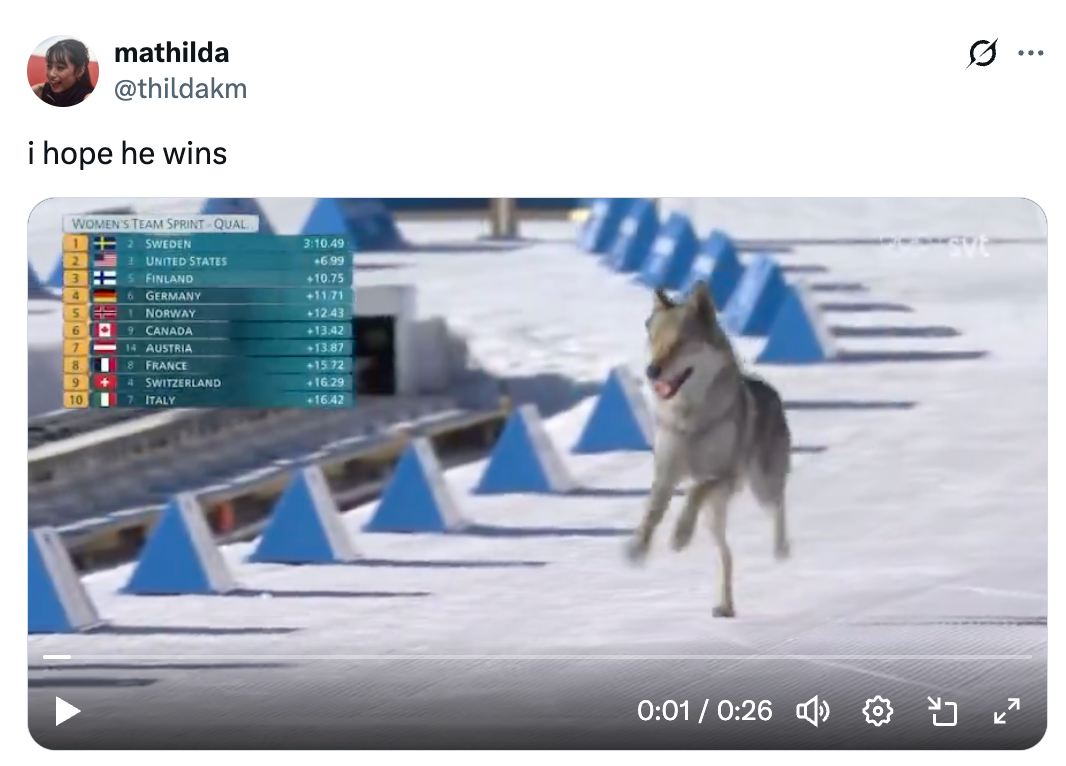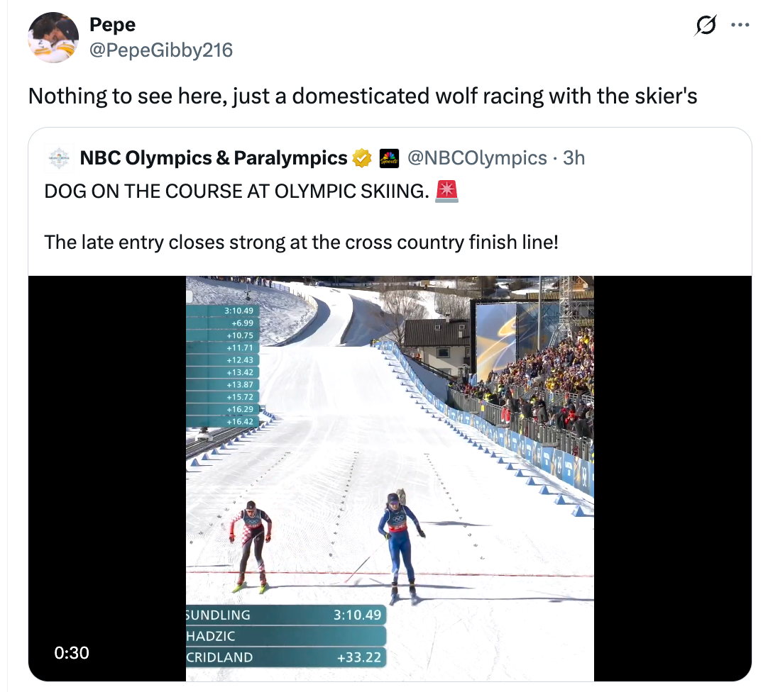 I truly can't believe this really happened. DOG ON THE COURSE AT OLYMPIC SKIING. 🚨The late entry closes strong at the cross country finish line! pic.twitter.com/o4mO28tXXW