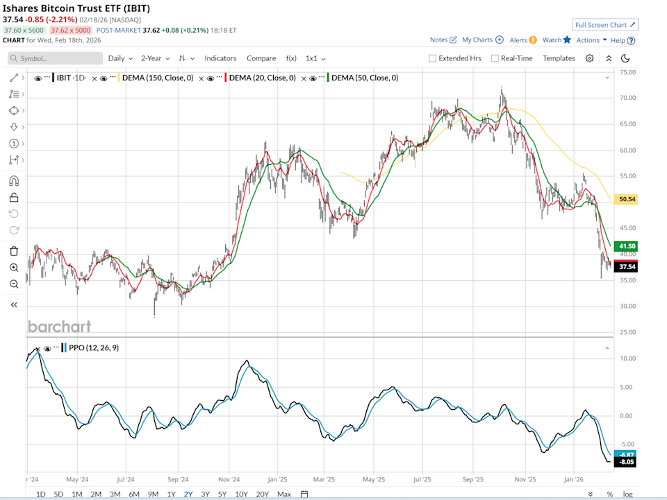 As a technician to the core, I can’t help but look at the below chart and think to myself, “That’s one way to be a store of value.” Ishares Bitcoin Trust ETF's (IBIT) price is flat over two years. But yes, I’m burying the lead there. Lots of gyrations to get to zero returns over that time. My assessment of this daily chart is simple. This might be Bitcoin’s (BTCUSD) last stand, in that if its price gets buried at the next level down ($30? Below $30?), it could take a long time to recover. Has Palantir Bottomed? Probably, Based on Huge, Unusual Put Options Activity in PLTR QQQ Just Sent a Chilling Signal — Right Before Nvidia Earnings SoftBank Just Sold $3.6 Billion Worth of Nvidia Stock. Should You Ditch NVDA Too? Our exclusive Barchart Brief newsletter is your FREE midday guide to what's moving stocks, sectors, and investor sentiment - delivered right when you need the info most. Subscribe today! If at all. By the way, that’s about 20% down from here. Or in Bitcoin price terms, about $53,000. After a few decades in and around financial markets, and making more investment decisions than I could ever remember, I’ve developed several features of modern markets that I refer to as “facts of life.” Among them is this: Popular assets, be they stocks, exchange-traded funds (ETFs) or other assets, don’t always just go away. They hang around, often for decades, as once uber-popular places for traders and investors to partake in. But essentially, they are demoted to forgotten tickers, if you will. I cannot say with any certainty that Bitcoin will be one of those. But if it doesn't get its act together soon, it could risk being one of the more notable “facts of life” victims I can recall. I’ve lived and invested through: Dot-com stocks Underground cable stocks Collaterized debt obligations (CDOs) Junk bonds — when they really were junk Special purpose acquisition companies (SPACs) 3D-printing stocks( and at least 1 ETF) One day, I wonder if ETFs like IBIT and its many peers will adorn that historical list. Not to mention other crypto products. Because as I see it, the debate surrounding Bitcoin has shifted from, "Will it survive?" to "What is its actual purpose?” This, in a world where digital finance is becoming the norm. As the original cryptocurrency faces a stagnant price range and mounting competition from traditional assets, the narrative is split between those seeing a final exit and those seeing a structural evolution. There is a slow trickle of evidence that the basic pillars supporting the Bitcoin-to-the-moon narrative are beginning to crumble under the weight of a changing global economy. Bitcoin was long touted as the ultimate hedge against inflation and a falling dollar. But during the recent bouts of global inflation, Bitcoin often behaved more like a high-risk tech stock than some sort of digital gold. When the Nasdaq 100 fell, Bitcoin fell in sympathy, even as interest rates rose. In addition, governments across the globe have transitioned from ignoring crypto to aggressively regulating it. The introduction of central bank digital currencies (CBDCs) and stricter anti-money-laundering rules has stripped away some of that very outsider appeal that originally drove Bitcoin's adoption. And, now more than 15 years into its life, Bitcoin is still rarely used for everyday transactions. To be clear, I do not have a horse in this race, so to speak. I’ve done nicely just “renting” crypto ETFs and options on them the past couple of years to try to catch up and down waves. And boy, have there been a lot of both! Still, the lack of a real-world use case beyond speculation suggests that the market may finally be running out of new buyers to keep the price afloat. But as others will argue, perhaps Bitcoin isn't dying. Maybe it is simply maturing into a boring, reliable institutional asset. The launch of spot ETFs and the inclusion of Bitcoin in corporate treasuries have created a structural floor for the price. Major financial institutions are no longer debating its existence; they are building the plumbing to offer it to every retirement account in America. And, while its correlation with tech is high, some investors still view Bitcoin as a lifeboat-like asset in regions with failing currencies or unstable banking systems. In this view, Bitcoin doesn't need to be a currency; it just needs to be a portable, un-hackable vault. The line in the sand for Bitcoin is institutional flow. If the daily inflows into Bitcoin ETFs begin to turn into sustained outflows, it will signal that the market has lost interest in the digital gold narrative, and the other positive cases for long-term holding of crypto in public market-traded form. I imagine somewhere they still trade 3D-printing stocks “in size.” But after all the fuss about Bitcoin ETFs coming to market, and the deluge of demand we saw for a while, this would likely be the biggest case of a “fact of life” asset going down I can recall. Rob Isbitts created the ROAR Score, based on his 40+ years of technical analysis experience. ROAR helps DIY investors manage risk and create their own portfolios. For Rob's written research, check out ETFYourself.com. On the date of publication, Rob Isbitts did not have (either directly or indirectly) positions in any of the securities mentioned in this article. All information and data in this article is solely for informational purposes. This article was originally published on Barchart.com