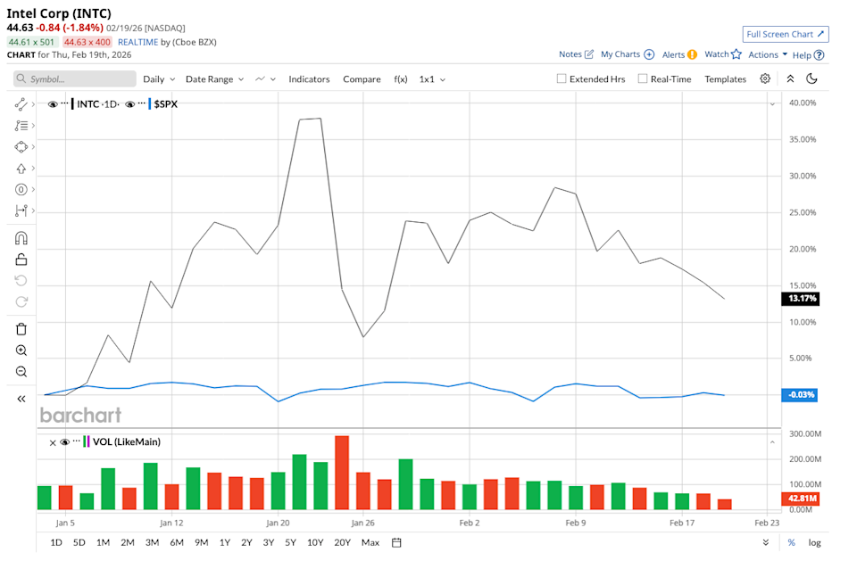 When Nvidia (NVDA) expresses interest in any company, investors should pay attention. According to a recent 13F-filing, Nvidia has invested a hefty amount of around $7.9 billion in Intel (INTC), now holding 214,776,632 shares of INTC stock. The timing is not random. Intel has been in the spotlight as it rebuilds its foundation for the artificial intelligence (AI) age. This investment signals Nvidia's confidence in Intel's comeback story. QQQ Just Sent a Chilling Signal — Right Before Nvidia Earnings Has Palantir Bottomed? Probably, Based on Huge, Unusual Put Options Activity in PLTR SoftBank Just Sold $3.6 Billion Worth of Nvidia Stock. Should You Ditch NVDA Too? Markets move fast. Keep up by reading our FREE midday Barchart Brief newsletter for exclusive charts, analysis, and headlines. INTC stock is up 21% so far this year, outperforming the S&P 500 Index ($SPX). Should you grab INTC stock now? Valued at $227 billion, Intel designs and manufactures semiconductor chips that power PCs, data centers, and AI systems. During the fourth-quarter earnings call, management emphasized that Intel’s biggest issue is constrained supply and not weak demand. Intel saw strong demand across client computing, data centers, AI infrastructure, custom silicon, and networking. The company reported $52.9 billion in total revenue in 2025, flat year-over-year (YOY). However, the firm also reported a profit of $0.42 per share, compared to a loss of $0.13 in 2024. For Nvidia, which relies on CPUs as host processors in AI systems, deeper integration with Intel strengthens its ecosystem positioning. This is especially relevant now that Intel is building a custom Xeon that is fully integrated with Nvidia's NVLink technology. Another strategic asset Intel brings to the table is the ability to deploy devices based on Intel 18A, the most sophisticated semiconductor process created and manufactured in the United States. Nvidia relies heavily on external foundry capacity. Thus, having a strategic ownership in a U.S.-based advanced manufacturing partner provides Nvidia with supplier diversity, risk mitigation, and greater manufacturing control, giving it a competitive advantage. Furthermore, Intel is not seeking short-term aggressive growth. Instead, the company is focusing on stabilizing yields, improving wafer starts across current nodes, keeping a tight capital allocation, and delaying spending on 14A nodes until customers commit. These strategic moves are likely why Nvidia chose Intel, as it reveals it could prove to be a stable and reliable long-term partner in advanced manufacturing and AI infrastructure. Intel’s balance sheet has also strengthened, thanks to strategic investments from Nvidia and SoftBank (SFTBY), government funding, and monetized assets involving Mobileye and Altera. Intel repaid $3.7 billion in debt and ended the year with $37.4 billion in cash and short-term investments. Analysts expect significant earnings recovery in the next two years, with earnings projected to rise by 15% in fiscal 2026 and 105% in fiscal 2027. INTC stock is trading at a premium of roughly 45 times forward 2027 earnings, reflecting investors’ confidence in its rebound story that AI-driven growth will boost profits. Heading into 2026, Intel is showing revenue stability, profit recovery, improving free cash flow, strong liquidity, controlled capital spending, and strong AI-related demand across segments. In short, Nvidia’s investment signals confidence in Intel’s long-term relevance in the AI ecosystem. Wall Street believes in Intel’s turnaround story as much as Nvidia and has allotted an overall “Hold" rating. Of the 45 analysts covering the stock, five rate it a “Strong Buy,” one has a “Moderate Buy” rating, 34 rate it a “Hold,” one analyst has a “Moderate Sell,” and four suggest a “Strong Sell" rating. As of this writing, INTC stock is trading close to its average target price of $45.26. However, the Street-high estimate of $66 suggests the stock has potential upside of 48% over the next 12 months. On the date of publication, Sushree Mohanty did not have (either directly or indirectly) positions in any of the securities mentioned in this article. All information and data in this article is solely for informational purposes. This article was originally published on Barchart.com