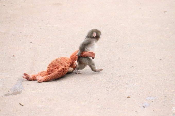 Punch carries his stuffed animal everywhere like a little tiny human. It is so cute and sad, it makes me want to cry. "The adult monkey that dragged Punch is probably the mother of the monkey with whom Punch tried to communicate," the zoo continued. They explained that "Punch has been scolded by other monkeys many times in the past and has learned how to socialize with them."