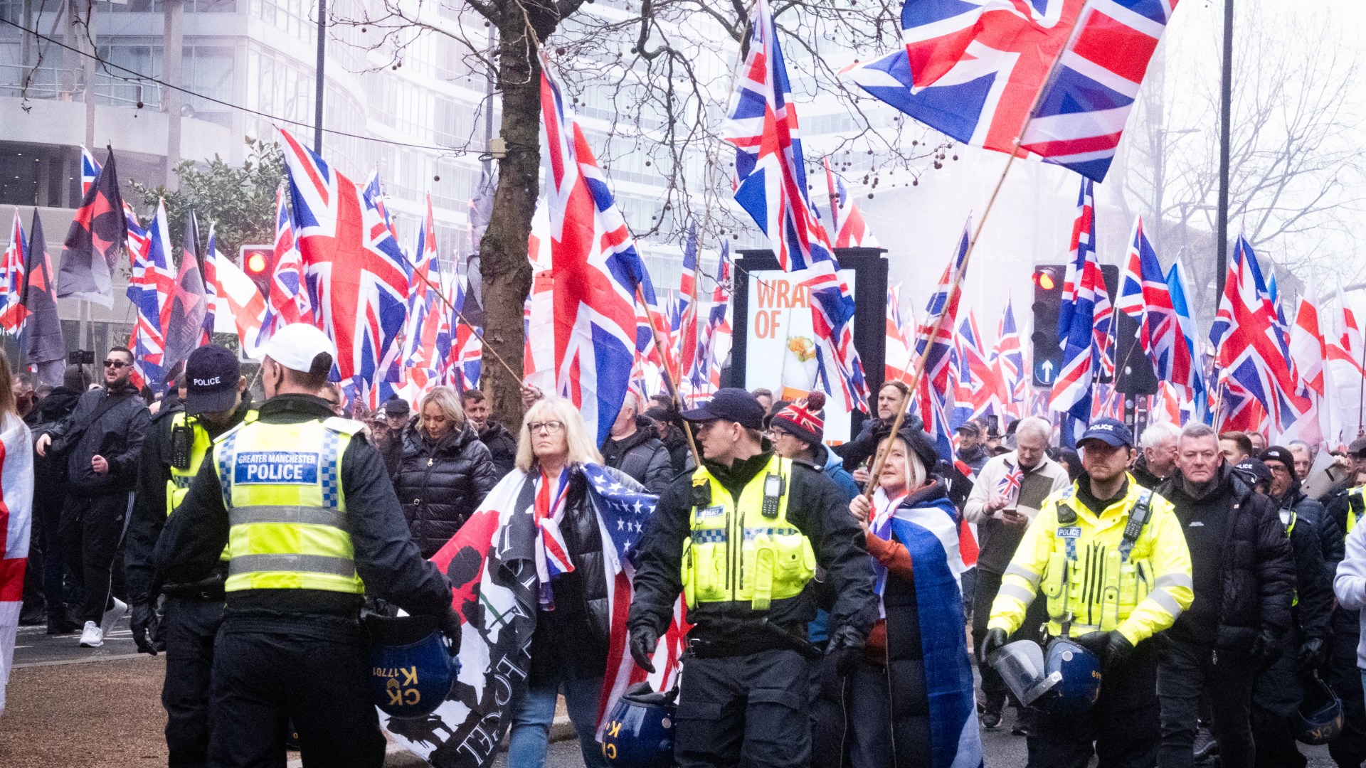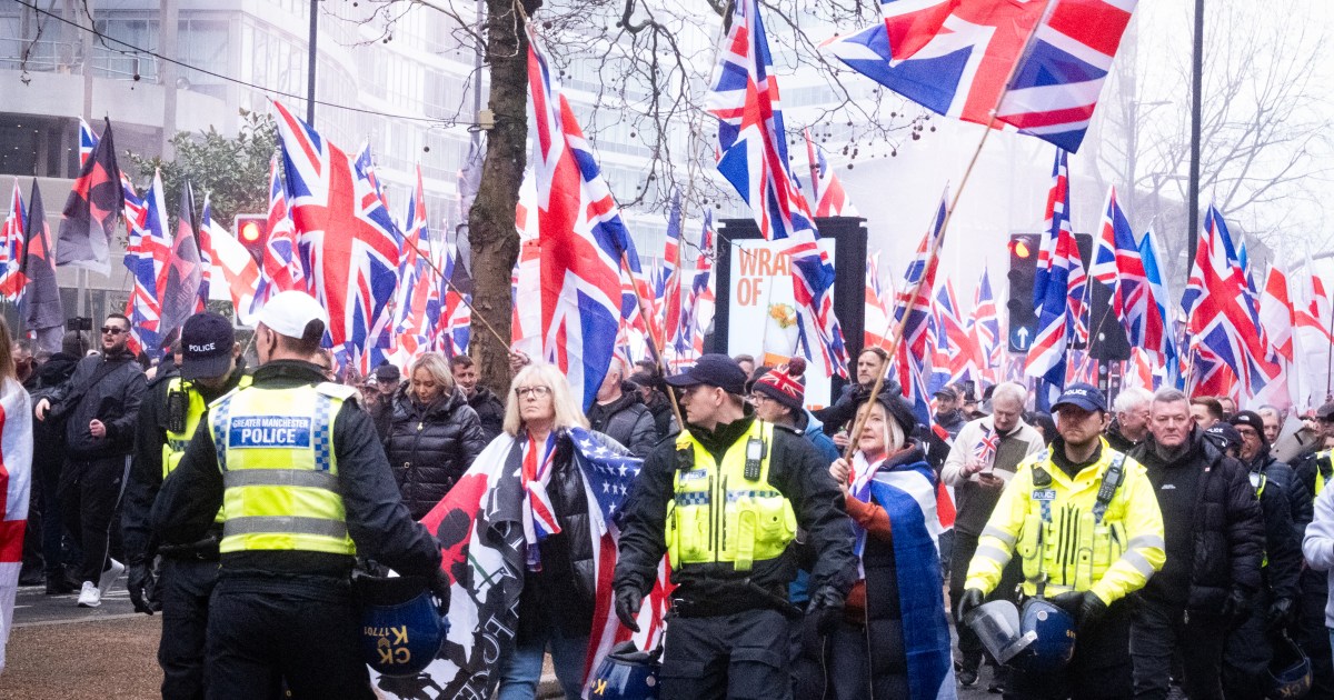 Hundreds of Britain First protesters faced larger antifascist crowds in a tense Manchester city centre standoff. Share Save Manchester, United Kingdom – Chants of “send them back” echoed through a damp underpass as hundreds of far-right anti-Islam protesters prepared to march through the streets. Union Jacks fluttered in the wind as protesters – some visibly under the influence of alcohol – chanted a series of anti-immigration slogans and derisive comments about British Prime Minister Keir Starmer. In response to the demonstration organised by Britain First, a far-right political party that calls for mass deportation and the removal of migrants and Muslims from the UK, a counterprotest was also planned for midday on Saturday. It formed a much larger crowd made up of antifascist protesters who gathered a few streets away, carrying antiracist banners and waving an array of flags, including the Palestinian flag. Ruby, 20, a student from South London, took a five-hour coach ride to show her support for the counterprotest and told Al Jazeera that attending was a “no-brainer”. She asked that her surname not be published, fearing repercussions. Ruby said her grandparents, originally from Montserrat, were part of the Windrush generation – immigrants invited to the UK between 1948 and 1971 from Caribbean countries – and, despite having given so much to their adopted country, are now feeling increasingly unwelcome. She said her grandparents had told her they were witnessing a return to the levels of racism they experienced when they came to the country in the 1950s. It was a sentiment echoed by Llowelyn, 16, a counter-protester from Wales who said her father, who is British Guyanese, has received more verbal abuse based on his race in the past few years than at any other point. The tension was palpable before the two marches were due to begin, with far-right agitators livestreaming to their followers as they entered the area assigned to the counterprotest. John – a stocky, tenacious counter-protester from Wales – confronted them with arms outstretched as police officers looked on. “They come here to cause a ruckus and make money of it online, but I come here to protect the left. These guys [far-right agitators] try and intimidate … minorities because they think they are a master race”, he told Al Jazeera. As the Britain First march began, flanked by police and led by Paul Golding, a portly, combative far-right activist who has previously been imprisoned for religiously aggravated harassment, the celebratory mood quickly turned aggressive as they came across counter-protesters in the city centre. “Leftie scum,” screamed one member of the Britain First crowd as they harassed three young people who staged a sit-down, forcing riot police to encircle and pull them to safety. The two marches finally met in an expletive-ridden crushendo as police struggled to hold ranks. Britain First protesters prodded counter-protesters with flag poles, and some slipped through the porous police lines as they shouted anti immigration and anti-Palestine slogans. A number of counterprotesters and bystanders expressed frustration that the police allowed the march to go ahead. “We, as Jews and internationalists, are having to confront Britain First, the fascists who are organising on the streets, who have been permitted to market their divisive, racist, dictatorial positions on our streets,” Pia Feig, of Jewish Action for Palestine, told Al Jazeera. Audrey, a teacher and counterprotester who was pushed away by police after being shoved by a Britain First protester, said the police always “protected” the far-right groups. A police officer told Al Jazeera that the day required extensive planning and was a particularly difficult operation, as the two groups kept changing their planned route. He said on condition of anonymity that handling the two conflicting protests, a rally in support of Ukraine, and managing crowds at large football fixtures held this weekend had stretched the local police force thin.