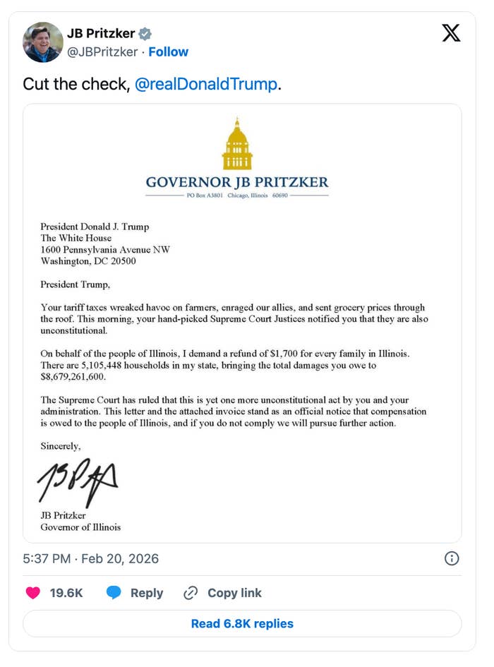 JB Pritzker's Message To Trump Following The Supreme Court's Tariff Ruling Is Going Viral