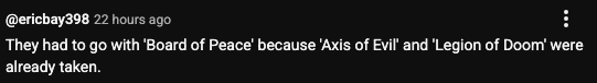 "Can we stop calling it 'The Board of Peace.' We should just call it what it is, 'The Legion of Doom.'" If you must know, I based my entire personality on Seasons 2-5 of "Girls," and I'm a huge gamer. If you're wondering who the allies that refused are, France, Italy, New Zealand, Norway, Sweden, and the United Kingdom declined invitations to the Board of Peace, and Trump rescinded the invitation to Canada.