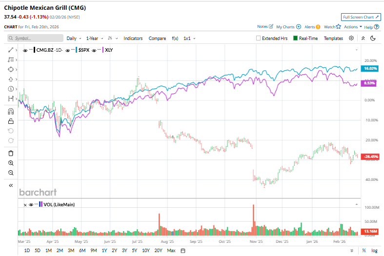 Chipotle Mexican Grill, Inc. (CMG) is a leading California-based fast-casual restaurant company that develops and operates a global chain of Mexican-inspired eateries specializing in customizable burritos, bowls, tacos, quesadillas, and salads prepared from fresh ingredients. With a market cap of $48.9 billion, Chipotle’s operations span the U.S., Canada, France, Germany, Dubai, and the U.K. The restaurant giant has massively underperformed the broader market over the past year. CMG stock prices have plummeted 29.2% over the past 52 weeks, compared to the S&P 500 Index’s ($SPX) 13% gains. In 2026, the stock has surged 1.5%, surpassing SPX’s marginal rise. If Palantir is Near a Bottom, What's the Best Play in PLTR Stock? NVDA Earnings, Tariffs and Other Key Things to Watch this Week Adobe (ADBE) Stock Has Been Beaten Up But the Smart Money Remains Resilient Get exclusive insights with the FREE Barchart Brief newsletter. Subscribe now for quick, incisive midday market analysis you won't find anywhere else. Narrowing the focus, CMG has also trailed the sector-focused State Street Consumer Discretionary Select Sector SPDR Fund’s (XLY) 4.7% uptick over the past year but has outpaced its 1.6% dip year-to-date. On Feb. 3, CMG shares climbed 1.7% after the company released its FY2025 Q4 earnings. Revenue rose 4.9% year over year to $3 billion, and adjusted EPS of $0.25 remained flat, edging past expectations. However, comparable sales declined 2.5% as lower customer traffic offset higher menu pricing and average check. Margins were pressured by wage inflation and softer volumes despite some food-cost relief, and the company continued to lean on expansion and capital returns, opening 132 restaurants in the quarter and repurchasing about $742 million of stock. For the full fiscal 2025, ending in December, analysts expect CMG to deliver an adjusted EPS of $1.14, down 2.6% year over year. On the positive note, the company has a solid earnings surprise history. It has surpassed the Street’s bottom-line estimates in each of the past four quarters. Among the 35 analysts covering the CMG stock, the consensus rating is a “Moderate Buy.” That’s based on 22 “Strong Buys,” three “Moderate Buys,” nine “Holds,” and one “Strong Sell.” This configuration is optimistic than two months ago, when 22 analysts gave “Strong Buy” recommendations. On Feb. 4, Citi analyst Jon Tower raised the firm’s price target on Chipotle to $49 from $48 and keeps a “Buy” rating on the shares. CMG’s mean price target of $44.84 represents a 19.4% premium to current price levels. Meanwhile, the street-high target of $54 suggests a massive 43.8% upside potential. On the date of publication, Kritika Sarmah did not have (either directly or indirectly) positions in any of the securities mentioned in this article. All information and data in this article is solely for informational purposes. This article was originally published on Barchart.com