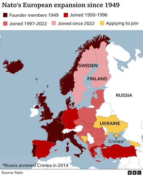 When Russian President Vladimir Putin ordered up to 200,000 soldiers into Ukraine, his aim was to sweep into the capital, Kyiv, in days, overthrow its pro-Western government and return Ukraine to Russia's sphere of influence. Putin failed but, four years on, a fifth of Ukrainian territory is in Russian hands. US President Donald Trump has been pushing for a peace deal. But a meeting with Putin in Alaska in August and several rounds of talks with Ukrainian and Russian negotiating teams have failed to yield any meaningful progress. Moscow continues to demand that Ukraine hand over sovereign territory - an unacceptable outcome for Kyiv. Launching the biggest European invasion since the end of World War Two, Putin gave a fiery speech on TV declaring his goal was to "demilitarise and denazify" Ukraine. Russia has repeatedly painted modern Ukraine as a Nazi state, in a crass distortion of history. Putin had already seized Ukraine's Crimean peninsula eight years earlier, after a revolution that ousted Ukraine's pro-Russian president and replaced him with a more pro-Western government. Putin then triggered a lower-level war in Ukraine's eastern Donbas region, with pro-Russian proxy forces occupying territory and setting up rebel states supported by Moscow. But the 2022 invasion was on a different scale. Putin had just recognised the rebel states as independent. Then, as the invasion began, he said the people there - many of whom are Russian speakers - needed protection from the Kyiv "regime". A day later, Putin called on Ukraine's military to "take power into your own hands" and target the "gangs of drug addicts and neo-Nazis" running the government. He then added another objective - to ensure Ukraine stayed neutral. He accused the Western defensive alliance, Nato, of trying to gain a foothold in Ukraine to bring its troops closer to Russia's borders. The Russian leader has long questioned Ukraine's right to exist, claiming that "modern Ukraine was entirely created by Russia" after the communist revolution in 1917. In a long-winded 2021 essay he even suggested "Russians and Ukrainians were one people" dating back to the late 9th Century. In 2024 he told US TV talk show host Tucker Carlson that Ukraine was an "artificial state". Those comments have led many to believe that the goal of the invasion was in effect to erase the state of Ukraine. Russia's state-run Ria news agency explained that "denazification is inevitably also de-Ukrainisation" - seemingly tying the idea of erasing Ukraine to the stated goal of the invasion. Ukrainian culture and identity have in fact existed for centuries independently of Russia. Fact-checking Putin's 'nonsense' history Zelensky - from comedian to wartime leader Putin has long sought to get rid of Ukraine's elected pro-Western president, and Zelensky was apparently a target from the very start of the war. Russian troops made two attempts to storm the presidential compound soon after the invasion, according to Zelensky's adviser, and Ukraine's elected leader said they wanted him dead. "The enemy has designated me as target number one; my family is target number two. "They want to destroy Ukraine politically by destroying the head of state." Zelensky said later that Putin had initially tried to replace him with the wealthy head of a pro-Russian party, Viktor Medvedchuk, who was accused of treason in Ukraine and is now in Russia. Even now, Putin has not agreed to peace talks with Zelensky and his officials call him a "loser" and a "clown". He has spoken of the Ukrainian leader's "illegitimacy" - a false narrative that has also been repeated by Trump. As evidence Putin cites the postponement of Ukraine's March 2024 presidential election, although it is because of Russia's war that Ukraine is under martial law and elections are barred under the constitution. Putin's own re-election in 2024 is highly questionable, as Russia's opposition leaders are either in exile or dead. Putin has for years complained about Nato's eastward expansion as a security threat, and sees any possibility of Ukraine joining the alliance as a major red line. Before Russia's 2022 invasion he demanded that Nato remove multinational deployments from the Central and Eastern European states that joined the Western alliance after 1997. But it was Russia that launched military action in Eastern Europe, when it invaded Georgia in 2008 and then Crimea in 2014. After the Crimea invasion, Nato established a continuous presence on its eastern flank - closest to Russia. Nato has always stressed the whole purpose of the alliance is to defend territories "with no aggressive intentions". Sweden and Finland have joined Nato in the past two years precisely because of the perceived Russian threat. It is part of Ukraine's constitution to join the European Union and Nato, but there was no real prospect of this when the full-scale war began. Zelensky said as much two weeks into the invasion: "Nato is not prepared to accept Ukraine." He has since said he would consider resigning in exchange for Nato membership, but Trump says Kyiv should "forget about" joining the Western alliance. Putin has accused Nato of participating in the war, because its member states have increasingly sent Ukraine military hardware, including tanks and fighter jets, air defence systems, missile systems, artillery and drones. Nato has provided security assistance and training to Ukraine, but it insists that does not make it a party to the war. Putin's grievance against Nato dates back to 1990, when he claims the West promised not to expand "an inch to the East". However that was before the Soviet Union collapsed and it was based on a limited commitment made to then Soviet President Mikhail Gorbachev. Gorbachev said "the topic of Nato expansion was never discussed" at the time. Read more: What is Nato? The most likely route is through direct talks, although previous rounds of negotiations between the two sides made little progress on a ceasefire