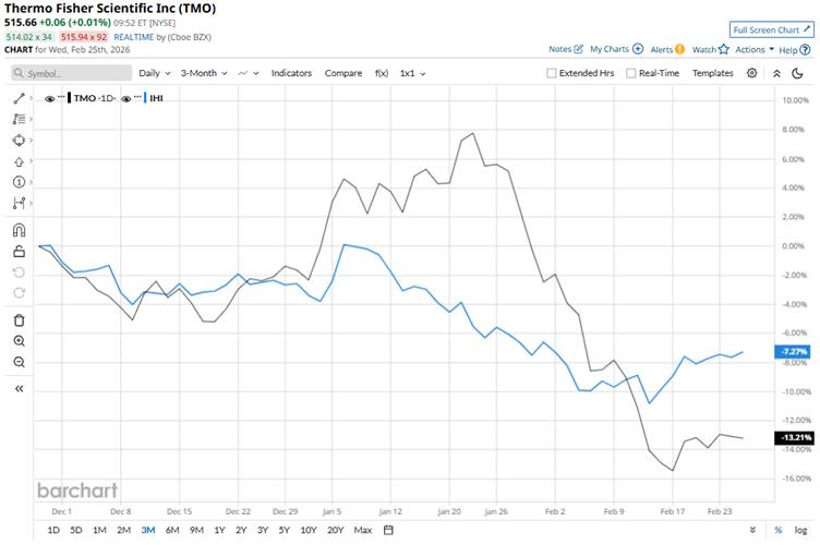 Thermo Fisher Scientific Inc. (TMO) is a leading life sciences and technology company that develops and supplies scientific instruments, laboratory equipment, specialty diagnostics, reagents, and biopharmaceutical services used across research, healthcare, and industrial markets worldwide. The company is headquartered in Waltham, Massachusetts, and is growing rapidly through acquisitions and innovation in analytical technologies and laboratory services. Thermo Fisher Scientific’s market cap is around $193.7 billion, making it one of the largest firms in healthcare and diagnostics globally. Companies worth $10 billion or more are typically referred to as “large-cap stocks.” Thermo Fisher Scientific surpasses this benchmark, highlighting its substantial size, financial stability, and broad influence in the life sciences and medical technology industries. The company has built a dominant presence across research, diagnostics, laboratory equipment, and biopharma services, supported by significant investment in research & development, global operational scale, and strong integrated systems that enhance productivity and quality. Micron Stock Trades Near Record High — Cash Out or Hold On? Microsoft Stock Just Flashed an Ultra-Rare Bullish Signal for Options Traders Western Digital Is Selling Sandisk Stock. Should You? Our exclusive Barchart Brief newsletter is your FREE midday guide to what's moving stocks, sectors, and investor sentiment - delivered right when you need the info most. Subscribe today! TMO is currently down 19.9% from its 52-week high of $643.99, achieved on Jan. 22. Moreover, shares have plummeted 12% over the past three months, lagging behind the iShares US Medical Devices ETF (IHI), which has declined 7.5% over the same time frame. TMO is down 11% on a YTD basis and 3.7% over the past 52 weeks. By contrast, IHI has declined 4.1% in 2026 and 6.8% over the past year. TMO has been trading above its 50-day moving average since early July 2025, but has fallen below the line this month. It has been trading above the 200-day moving average since early October 2025. Thermo Fisher Scientific’s stock has been under pressure mainly because investors are reacting to cautious guidance despite solid earnings beats. The company beat expectations in its Q4 2025 earnings with revenue of about $12.2 billion (7% year-over-year growth) and adjusted EPS of $6.57 (8% growth), topping Wall Street estimates, and full-year 2025 revenue grew 4% to around $44.6 billion. However, its 2026 outlook came in somewhat cautious with management guiding growth of 4% to 6% to around $46.3 billion to $47.2 billion in revenue and adjusted EPS around $24.22 to $24.80, which was below expectations and reflects pressure from cuts in academic research funding and slower biotech demand. In comparison, its competitor IDEXX Laboratories, Inc. (IDXX) shares are down just 4% YTD and a 40% surge over the past 52 weeks. Despite weak price performance, analysts are highly optimistic about its prospects. The stock has a consensus rating of “Strong Buy” from 23 analysts covering it, and the mean price target of $668.52 indicates a 29.7% upside. On the date of publication, Subhasree Kar did not have (either directly or indirectly) positions in any of the securities mentioned in this article. All information and data in this article is solely for informational purposes. This article was originally published on Barchart.com