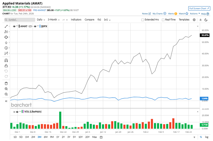Santa Clara, California-based Applied Materials, Inc. (AMAT) provides manufacturing equipment, services, and software to the semiconductor, display, and related industries. Valued at $299.9 billion by market cap, the company’s customers include semiconductor wafer and integrated circuit manufacturers, flat panel liquid crystal displays, solar photovoltaic cells and modules, and other electronic devices manufacturers. Companies worth $200 billion or more are generally described as “mega-cap stocks,” and AMAT definitely fits that description, with its market cap exceeding this threshold, reflecting its substantial size, influence, and dominance in the semiconductor equipment & materials industry. AMAT holds a commanding position in the semiconductor equipment market, particularly in deposition technology. Its leadership is backed by continuous investments in research and development, ensures that its technology remains cutting-edge, providing a competitive advantage in a rapidly evolving industry. Micron Stock Trades Near Record High — Cash Out or Hold On? Microsoft Stock Just Flashed an Ultra-Rare Bullish Signal for Options Traders Western Digital Is Selling Sandisk Stock. Should You? Stop Missing Market Moves: Get the FREE Barchart Brief – your midday dose of stock movers, trending sectors, and actionable trade ideas, delivered right to your inbox. Sign Up Now! Despite its notable strength, AMAT shares touched their 52-week high of $380.51 in the last trading session. Over the past three months, AMAT stock has gained 63.7%, outperforming the S&P 500 Index’s ($SPX) 2.8% gains during the same time frame. Shares of AMAT rose 47.1% on a YTD basis and climbed 124.2% over the past 52 weeks, notably outperforming SPX’s YTD marginal gains and 15.2% returns over the last year. To confirm the bullish trend, AMAT has been trading above its 50-day and 200-day moving averages since mid-September, 2025, with slight fluctuations. Applied Materials' strong performance is driven by AI demand and advanced node transitions. Customers are investing in 3D scaling and leading-edge tech, boosting growth. Management expects sustained wafer fab equipment spending and focus on advanced packaging. On Feb. 12, AMAT reported its Q1 results, and its shares closed up more than 8% in the following trading session. Its adjusted EPS of $2.38 topped Wall Street expectations of $2.19. The company’s revenue was $7 billion, topping Wall Street forecasts of $6.9 billion. For Q2, AMAT expects its adjusted EPS to range from $2.44 to $2.84, and revenue in the range of $7.2 billion to $8.2 billion. AMAT’s rival, Lam Research Corporation (LRCX) shares lagged behind the stock, with a 42.7% uptick on a YTD basis but outpaced the stock with 193.1% gains over the past 52 weeks. Wall Street analysts are bullish on AMAT’s prospects. The stock has a consensus “Strong Buy” rating from the 36 analysts covering it, and the mean price target of $395.78 suggests a potential upside of 4.7% from current price levels. On the date of publication, Neha Panjwani did not have (either directly or indirectly) positions in any of the securities mentioned in this article. All information and data in this article is solely for informational purposes. This article was originally published on Barchart.com