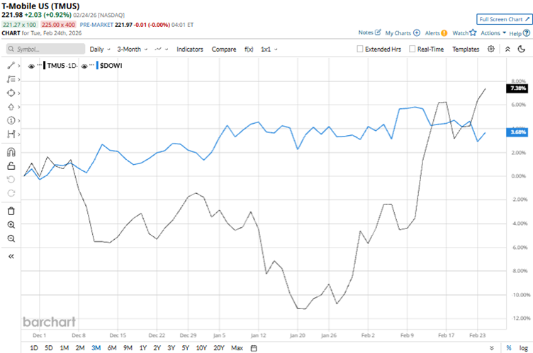 T-Mobile US, Inc. (TMUS) operates as a leading wireless carrier, delivering voice, messaging, and data services nationwide through its expansive network. Headquartered in Bellevue, Washington, the company focuses on innovative customer experiences and reliable connectivity. The company has a market capitalization of $242.35 billion, which classifies it as a “mega-cap” stock. T-Mobile’s stock reached a 52-week low of $181.36 on Jan. 21, but is up 22.4% from that level. The stock has been up 7.1% over the past three months. Contrarily, the broader Dow Jones Industrial Average ($DOWI) is up 5.9% over the same period. Therefore, the stock has outperformed the wider index over this period. Micron Stock Trades Near Record High — Cash Out or Hold On? Microsoft Stock Just Flashed an Ultra-Rare Bullish Signal for Options Traders Western Digital Is Selling Sandisk Stock. Should You? Get exclusive insights with the FREE Barchart Brief newsletter. Subscribe now for quick, incisive midday market analysis you won't find anywhere else. However, the company has been facing competitive pricing pressures in the telecom sector. Over the past 52 weeks, the stock has dropped 17.2%, while the Dow Jones index is up 13.2%. T-Mobile’s shares have increased 9.3% year-to-date (YTD), while the index has gained 2.3%. The stock is hovering near its 200-day moving average but has traded above its 50-day moving average since mid-February. T-Mobile’s stock gained 5.1% intraday on Feb. 11, as the company reported better-than-expected fourth-quarter results. Its revenue grew by 11.3% year-over-year (YOY) to $24.33 billion, including a 13.9% increase in postpaid service revenues to $15.38 billion. However, its diluted EPS fell 26.8% YOY to $1.88, driven by severance and related costs associated with the company’s 2025 workforce transformation and reinvestment initiative. T-Mobile expects total postpaid net account additions in 2026 to be between 900,000 and 1 million, with service revenue of approximately $77 billion. For the current year, Wall Street analysts expect the company’s diluted EPS to grow by 4.2% YOY to $10.59. We compare T-Mobile’s performance with that of another popular telecom services stock, AT&T Inc. (T), which has gained 6% over the past 52 weeks and 14.1% YTD. Therefore, T-Mobile has been the clear underperformer over these periods. Wall Street analysts are moderately bullish on T-Mobile’s stock. The stock has a consensus rating of “Moderate Buy” from the 30 analysts covering it. The mean price target of $267.38 implies a 20.5% upside from current levels. The Street-high price target of $310 indicates a 39.7% upside. On the date of publication, Anushka Dutta did not have (either directly or indirectly) positions in any of the securities mentioned in this article. All information and data in this article is solely for informational purposes. This article was originally published on Barchart.com