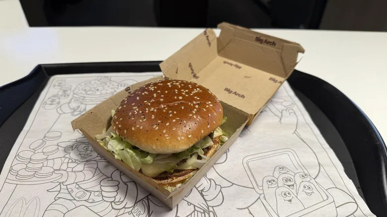 McDonald's is constantly striving to fulfill a balance of serving nostalgia, while moving forward and delivering new flavors to meet modern tastes. In the last year alone, it caved to fans' demands and resurrected the Snack Wrap, and even blew off the dust and rust of one of its most memorable Happy Meal toys ever โ Changeables. McDonald's has never been afraid to follow a trend, like its recent dip into Hot Honey territory, or even import an idea that has worked well overseas, like McShaker Fries. Its next release also takes its cue from a popular McDonald's item from abroad, in what has now become perhaps the most anticipated new McItem of them all โ the Big Arch. This whopper of a burger, with a brand new sauce, bun, cheese, and crispy onions, has been making the rounds in several international locations since 2024, with an eye on taking over America today. Upon its intial release, McDonald's President and CEO Chris Kempczinski called The Big Arch, "A quintessential McDonald's burger with a twist on our iconic familiar flavors." We at The Takeout were hoping the Big Arch would enter our Golden Arches in 2025, but had to settle on 2026. It's finally our turn to take a taste of this next gen McDonald's burger. There are so many questions, but the main one remains โ is the Big Arch the next big McThing, or is it a big swing and miss? The Takeout headed to McDonald's to try it out and find out where the truth lies. All can finally be revealed in this saucy McChew & review! Read more: Fast Food Chains That Serve The Highest And Lowest Quality Burgers While March 3 was circled on our calendars as the official big release day for the Big Arch, I noticed social media was already abuzz with people gobbling them up in their cars. Lo and behold, it was available in advance of its due date at my local McDonald's in New York City. I scurried over, right after digesting some mighty awesome Krispy Kreme x Oreos doughnuts, to have lunch after dessert. I ordered the Big Arch as is, then a second one with extra sauce, pickles, and crispy onions, as well as a Big Mac for comparison. I ate the burgers onsite, in several rounds of tastings. This review is a summation of my own personal tastes and opinions. I also took into consideration my previous experiences with McDonald's, its roster of burgers, and my current experience with the Big Arch. The ultimate criteria considered for this chew and review were flavor, appearance, presentation, smell, texture, value, familiarity, originality, uniqueness, archiness, and ultimately, whether this burger was the next big thing or not. Stay tuned for the answer. Over its illustrious history, McDonald's has hit a couple home run burgers that dwarfed the size of its classic original, with the Big Mac going national in 1968, and the Quarter Pounder weighing in since 1973. Those remained the golden arched standard for decades, although the chain has often tried to introduce the next best and biggest thing over the ensuing decades to find a home on its menu. Burgers like the McD.L.T. and McLean Deluxe have come and gone, and have mostly been forgotten. There was even one called The Arch Deluxe, but it wasn't luxurious enough to stick around. The "Arch" is now being utilized to headline a new burger, The Big Arch, which debuted at McDonald's in Portugal back in 2024, before appearing in the chain's outposts in Germany, France, United Kingdom, and Canada. Positive feedback and sales have warranted the burger a permanent place on menus overseas, and McDonald's U.S. is hoping the same will be true after its limited time launch in 2026. The Big Arch starts with two juicy quarter-pound beef patties, topped with three slices of melty white cheddar cheese, crispy and slivered onions, pickles, lettuce, and a brand new Big Arch sauce. It's all sandwiched between a new toasted sesame and poppy seed bun. McDonald's describes the Big Arch sauce as "tangy, creamy, with the perfect balance of mustard, pickle and sweet tomato flavors." The Big Arch is officially launching at participating nationwide McDonald's locations on March 3, but your local restaurant may already have it available on the menu. The Big Arch is a limited time offering, here to stay for an unspecified time. It's available to order when breakfast ends and switches over to the day menu, while supplies last. The Big Arch can be ordered in-store at the counter, kiosk, or drive-thru, where available. It can also be ordered in advance for dine-in, pick-up, or even delivery. There may be additional fees for orders placed for delivery or through third party apps and websites. Prices will vary by location, but at the Manhattan location where I ordered mine, the Big Arch retailed for $9.49, and could be made into a meal, including fries and a drink, starting at $14.98. Like most items at McDonald's, the Big Arch is completely customizable to remove or add given ingredients, or add extra ones like three half strips of bacon or three slices of Roma tomato. Extra or add-on ingredients come at an additional cost, which will also vary by location. The Big Arch's burger patties are 100% beef, and contain no fillers or extenders. They are simply seasoned with salt and black pepper. The Big Arch's bun pops with poppy and sesame seeds, and in its make-up, contains wheat and malted barley enriched flour, as well as salt, vinegar and corn starch. The Big Arch Sauce combines the talents of water, soybean oil, tomato paste, vinegar, sugar, egg yolks, salt, and contains 2% or less of modified corn starch, mustard, spice, garlic powder, onion powder, xanthan gum, lemon juice concentrate, turmeric and paprika extract for color, and natural flavors including celery seed extract. If you were wondering how the Arch sauce may differ from the Big Mac sauce, thekey inclusion is a tomato flavor. One Big Arch nets an eater some big numbers in the form of an astounding 1020 calories, 59 grams of total carbohydrates, 65 grams of total fat, 25 gra