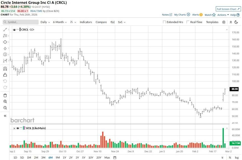 Circle Internet Group (CRCL) shares are inching further up on Thursday as investors continue to cheer its strong Q4 print, featuring a more than 400% year-over-year growth in adjusted EBITDA. Still, a senior Seaport Global analyst, Jeff Cantwell, believes this crypto-focused fintech firm will push meaningfully higher from here through the remainder of 2026. Cantwell’s bullish call on Circle stock is particularly significant given it’s already trading up some 75% versus its year-to-date low in early February. 3 Highest Rated Dividend Kings for Generations of Income As Nvidia Launches New AI Laptop Chips, Should You Buy NVDA Stock? GE Aerospace Is Linking Up with Palantir. Should You Buy GE Stock Here? Our exclusive Barchart Brief newsletter is your FREE midday guide to what's moving stocks, sectors, and investor sentiment - delivered right when you need the info most. Subscribe today! In a post-earnings research note, Seaport Global maintained its “Buy” rating on CRCL stock, with a Street-high $280 price target, citing massive acceleration in on-chain utility. The NYSE-listed firm recorded a breathtaking $11.9 trillion in transaction volume for Q4, a 247% increase reinforcing that USDC is successfully transitioning into a global settlement layer. By providing the plumbing for “programmable money,” Circle is capturing a dominant share of the burgeoning decentralized finance (DeFi) ecosystem, Cantwell told clients. The company’s Q4 release, according to Cantwell, is a proof-of-concept for its ability to generate high-margin fees from network activity, irrespective of the Bitcoin price action. Seaport recommends owning Circle shares in 2026 for a robust diversification strategy as well. The crypto company’s other revenue, which includes CPN (Circle Payments Network), jumped to nearly $37 million in the fourth quarter, handily beating Street estimates. In his report, Cantwell also pointed to the upcoming mainnet launch of Arc — Circle’s proprietary blockchain — as the next major valuation re-rating event. By enabling institutional-grade tokenization of real-world assets, Arc could transform CRCL from a stablecoin issuer into a full-scale financial infrastructure powerhouse, helping justify its premium multiple, he concluded. While not nearly as bullish as Seaport Global, other Wall Street firms remain constructive on Circle Internet Group as well. The consensus rating on CRCL shares remains at “Moderate Buy,” with the mean target of roughly $126 indicating potential upside of nearly 45% from here. This article was created with the support of automated content tools from our partners at Sigma.AI. Together, our financial data and AI solutions help us to deliver more informed market headline analysis to readers faster than ever. On the date of publication, Wajeeh Khan did not have (either directly or indirectly) positions in any of the securities mentioned in this article. All information and data in this article is solely for informational purposes. This article was originally published on Barchart.com