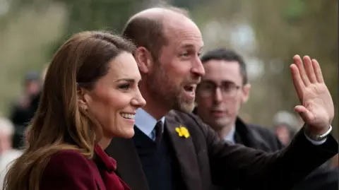 Catherine, Princess of Wales has talked about her passion for mothers' mental health during a rainy visit to mid Wales. In Newtown, Powys, she met with members of Mums Matter, a perinatal service for women experiencing mental health problems linked to early motherhood. Ella Hopkins, 25, who started volunteering with the service after fleeing domestic violence with her 10-month-old son Marcus, described her as "absolutely incredible". "She got really invested, she was asking lots of questions, you could tell she thought it was an important thing to be focusing on," she said. "She definitely said that it's something that she said felt passionate about, parents being able to be committed and devoted through their own stability," Hopkins said. Catherine and the Prince of Wales were visiting Wales ahead of St David's Day on Sunday. The pair first travelled to The Hanging Gardens in Llanidloes, a community project focused on resilience and creativity, before going on to visit an art gallery in Newtown. They arrived at the first venue to cheers from crowds who had gathered outside despite the wet weather, many waving Welsh flags and holding bunches of daffodils. At the end of their visit they also stopped to spend 25 minutes in the heavy rain chatting to well-wishers, with Catherine giving high-fives and hugs and William posing for selfies. The pair ordered hot drinks at the Llanidloes cafe before sitting down to chat with people making Welsh language festival signs. The prince and princess, both wearing daffodils on their lapels, also visited a forge and met nursery children aged three and four waiting with signs they had drawn. They greeted Ollie Jones, 21, and watched him make a hook before going to the centre's performing arts space to see schoolchildren perform Welsh songs. The couple went on to producers in the adjoining market - with William sampling a glass of cider - before going into the kitchen where traditional cawl and Welsh cakes were being made ahead of St David's Day on Sunday. This was due to be the end of their visit but after getting into their vehicle and being driven for a short period, William and Catherine stepped out to meet cheering crowds that had gathered, including children who handed them bunches of flowers and pictures they had drawn. William spotted a group of children holding up a scarf for Aston Villa, the football club he has supported since his school days. "That's a great way to get my attention," he told them. Meanwhile the Princess of Wales spoke to members of the public outside about the performance by the children at Llanidloes school, saying: "It was so lovely to meet the children singing inside - they were incredible." While in the kitchen, Catherine spoke about the importance of The Hanging Gardens and described places like it as "a lifeline to so many people in the community". Following the visit, they headed to Oriel Davies - a public contemporary art gallery based in Newtown - before attending a celebration of volunteer groups at Hafan yr Afon, a hub for culture, community and heritage in the town. At Oriel Davies, they learnt about a community arts project supporting children and young people's wellbeing. "It's amazing what's happening here," Catherine told the families. "It must be such a lovely way to make friends and share stories." The initiative has brought together local families, including those from Syrian and Afghan refugee backgrounds, for regular creative workshops led by artist Nicky Arscott. Arscott said the couple would see work created by the year-long programme, including a collaborative tablecloth made from materials gathered over months of sessions. "We just did regular art workshops, exploring different materials, and we ended up making a table cloth which gathered all the materials over the course of the months... which now forms part of the exhibition," she said. The project, known as Hand in Hand, focuses on how art can support wellbeing, particularly for primary school-aged children. Ahead of the visit, youngsters prepared handmade jewellery in the gallery's education room. "We've been making jewellery in the education room to prepare for the visit. I think there have been four or five bracelets made for Kate, a couple of necklaces made out of beads and jewellery," Arscott added. At Hafan yr Afon, Catherine spent time with members of Mums Matter, a perinatal service for women who are experiencing mental health problems linked to early motherhood. She met with Ella Hopkins, a volunteer with the service. "[Catherine] definitely said that it's something that she said felt passionate about, parents being able to be committed and devoted through their own stability," Hopkins said. Andrew's arrest has changed the public's view of the Royal Family, putting pressure on Prince William as he moves closer to being king. How the line of succession passes through generations of the Royal Family Prince William has offered his advice to those struggling with their mental health, in a special Radio 1 panel discussion. Sam Stables raises nearly ยฃ50,000, which included a donation from Prince William. The previously unseen photo was shared with the caption "Happy Valentine's Day" along with a heart emoji.