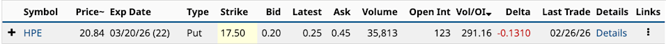 The big news from yesterday was Netflix (NFLX) dropping out of the race to buy the best parts of Warner Bros. Discovery (WBD), leaving Paramount Skydance (PSKY) as the winner of the hotly contested M&A battle. While investors appear happy about Netflix’s decision -- its shares are up about 8% in pre-market trading, about an hour to the open -- consumers clearly shouldn’t be. This consolidation will result in higher streaming prices, movie ticket prices, and the list goes on. Nvidia's Massive Free Cash Flow Margins Could Push NVDA Stock 45% Higher Here's Why I'm Looking at Nike Stock, Now That the Noise Has Died Down Netflix’s Unusual Options Activity: Was It the Bullish Signal Investors Were Waiting For or a Dead Cat Bounce? Stop Missing Market Moves: Get the FREE Barchart Brief – your midday dose of stock movers, trending sectors, and actionable trade ideas, delivered right to your inbox. Sign Up Now! Yesterday, I discussed Netflix’s unusual options activity from Wednesday's trading and concluded that the streaming service’s stock was about to move higher on an extended basis. Without the additional debt burden hanging over it, I have no doubt it will. In Thursday’s unusual options activity, March 20 DTEs (days to expiration) were extremely popular. Of the top 100 Vol/OI (volume-to-open-interest) ratios -- they ranged from 291.16 for Hewlett Packard Enterprise (HPE) to 23.69 for Netflix -- 52 expire in three weeks. Of the 52, 19 stocks have Vol/OI ratios of 23.69 or higher. Three of them have multi-leg options strategies with high profit-probability. Have an excellent weekend. Hewlett Packard Enterprise had the highest Vol/OI ratio yesterday at 291.16. The stock had a volume of 120,075, nearly six times its 30-day average. The March 20 $17.50 put accounted for 30% of its total options volume. The put/call ratio was 1.94, an extremely bearish number. Not surprisingly, the net trade sentiment was -3,432,000. Most large trades were at the bid price, which means traders were either taking profits on those puts or selling for premium, expecting the share price to remain where it is over the next 22 days, or move slightly higher. The high profit-probability play here is a Bear Put Spread. The Barchart Technical Opinion is a Sell with a 58% chance it will continue to move lower in the next 22 days. I’ve highlighted four of the long put strike prices that combine with the $17.50 short put. Of the four, I like the last one, the $23 long put, because it has the lowest cost at $2.55, the highest maximum profit, and a 45.1% likelihood of trading below $20.45 at expiration. Wells Fargo & Co. (WFC) had the 11th-highest Vol/OI ratio yesterday at 56.50. The stock had an options volume of 70,037, 1.4 times its 30-day average. The March 20 $81 put accounted for 19% of its total options volume. The put/call ratio was 2.06, indicating extremely bearish conditions. However, the put/call OI (open interest) ratio of 1.16, although slightly bearish, is down from January. The volume from the $81 put had only five trades of less than 10 contracts, with two (10,000 and 3,100) accounting for 98.7% of it. Wells Fargo's stock is down 12% in 2026, but up 7% for the past year. If you’re an income investor, its 2.2% dividend yield is about double the 1.14% dividend yield for the S&P 500 and 20 basis points higher than JPMorgan & Chase’s (JPM). In the past 5 years, including dividends, the large-cap bank has an annualized total return of 20.75%. Long-term, say five years, you’ll likely double your money once more. Analysts generally like it, with 18 of 27 rating it a Buy (4.19 out of 5), and a target price of $101.86, well above its current price. Its efficiency ratio at the end of Q4 2025 was 64.5%, down from 68.2% a year ago. In this case, lower is better. The efficiency ratio is the bank’s non-interest-related expenses divided by its revenue. It’s an indication that the bank is growing its deposits and loans without letting costs get away from it. Based on Wall Street’s 2026 earnings-per-share estimate of $6.92, its shares trade at a reasonable 12.5 times that amount. It’s a good long-term hold. As I write this in late morning trading, the markets are down, with WFC off more than 5%. That could put a wrinkle in my suggested strategy. At a closing price of $86.30, I thought the $81 put could make up one-half of a Covered Strangle, where you own 100 shares of its stock, and sell one $81 put for premium, while also doing a Covered Call by selling a call OTM (out of the money) for additional income. Now that the share price is hovering around $81.67, you might want to lower your put strike price by a few dollars to get about 6% OTM. That’s about $76 or $77. I went with the $77 because there’s more volume today. Your return on selling the put is 1.2%, which is 21.7% annualized, and an 81.39% chance that the share price at expiration in three weeks will be above the $76.05 breakeven. As for the covered call, you also want the call strike price to be OTM. In this example, you’re buying 100 shares for $8,228 [$82.28 * 100] and selling one $95 call expiring on March 20 for $10 in premium. Now, normally, if you’ve owned the stock for some time and have significant unrealized gains, you’d want to lower the strike price, which raises the premium, while capping your profits. Also, it’s important to note that if you do buy today and the stock rises above $95, the call buyer could exercise their right to buy the shares. At that point, you would have a short-term capital gain, which is taxed as regular income. Dow (DOW) had the second-highest Vol/OI ratio yesterday at 100.94. The stock had a volume of 401,360, eight times its 30-day average. The March 20 $20 call accounted for 10% of its total options volume. The put/call ratio was 0.01, an extremely bullish number. However, it can often signal bearish sentiment, indicating that traders believe a stock has been overbought. Up over 30% in the