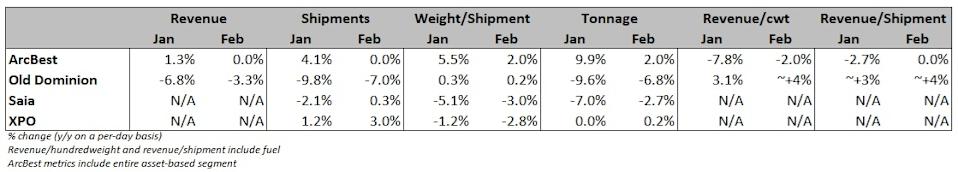 ArcBest reported flattish metrics for February as it awaits a more meaningful turn in less-than-truckload demand. Results at its asset-based segment appeared to decelerate from January, but the prior-year comparison was skewed by a particularly weak January 2025. The company’s asset-based unit, which includes LTL subsidiary ABF Freight, recorded no year-over-year change to revenue per day for February, according to a filing with the Securities and Exchange Commission. A 2% y/y increase in tonnage (entirely driven by higher weight per shipment) was offset by a 2% decline in revenue per hundredweight, or yield. (Higher shipment weights and lower fuel surcharges were headwinds to the yield calculation.) ArcBest’s (NASDAQ: ARCB) final results for January came in a little better than previously disclosed. Tonnage was 9.9% higher y/y versus its initial expectation for an 8% increase, which was provided on a quarterly call at the end of January. The notable y/y deceleration in volume growth during February was due to January’s easy prior-year comp (negative-9.2%). On a two-year-stacked comparison, tonnage was up 0.7% in January and flat in February. (Its daily revenue and yield metrics were close to flat on a two-year look as well.) The company said on the January call it had taken on more dynamically priced truckload shipments—pushing shipment weights higher but dragging yields lower—due to weakness across the manufacturing and housing sectors. ArcBest previously forecast first-quarter tonnage per day to increase by 4% to 5% y/y, which would be flat to up 1% on a two-year-stacked comparison. Quarter-to-date, tonnage is up 6% y/y. Manufacturing activity was modestly in expansion territory for a second straight month in February. The Purchasing Managers’ Index registered a 52.4 reading during the recent month, which was 20 basis points lower than January. (A reading above 50 signals expansion while one below 50 indicates contraction.) The dataset has largely been in negative territory for over three years. The new orders subindex—an indicator of future activity—came in at 55.8. (Inflections in PMI data usually lead LTL volumes by a few months.) The asset-based unit reported a 3% sequential yield increase in February (revenue per shipment was 2% higher) “due to pricing gains” and a step up in fuel surcharge revenue. Contract pricing renewals averaged 5% in the fourth quarter, the highest increase in six quarters and up 9.5% on a two-year-stacked comparison. ArcBest reiterated its prior asset-based operating margin guidance for the first quarter. The unit normally sees 260 bps of sequential deterioration, but the company expects to curb the degradation to just 100 to 200 bps this year given cost actions and the lower starting point (“softer-than-normal fourth quarter”). The guide implies a 97.7% adjusted OR at the midpoint, 180 bps worse y/y. Cost headwinds from expanding the network (800 incremental doors) and adding labor to support higher volumes will abate as throughput ramps. The company is also using training and better technology to improve efficiency and lower expenses. The asset-light segment, which includes truck brokerage, is now expected to see adjusted operating income “of up to $2 million” in the first quarter versus the prior outlook calling for a loss of up to $1 million. The unit operated at breakeven in the fourth quarter, as AI-enabled automation is helping to remove structural costs. Asset-light per-day revenue increased 10% sequentially in February as shipments grew 7% and revenue per shipment increased 3%. “We remain committed to maintaining yield discipline, managing costs, and positioning the segment for sustainable, long-term profitability,” the filing said. Shares of ARCB were off 2.5% at 11:24 a.m. EDT compared to the S&P 500, which was down 0.5%. More FreightWaves articles by Todd Maiden: Old Dominion ‘encouraged’ as declines moderate in February Saia’s tonnage declines moderate in February LMI: Freight market recovery in ‘full-swing’ The post ArcBest awaiting LTL demand inflection appeared first on FreightWaves.