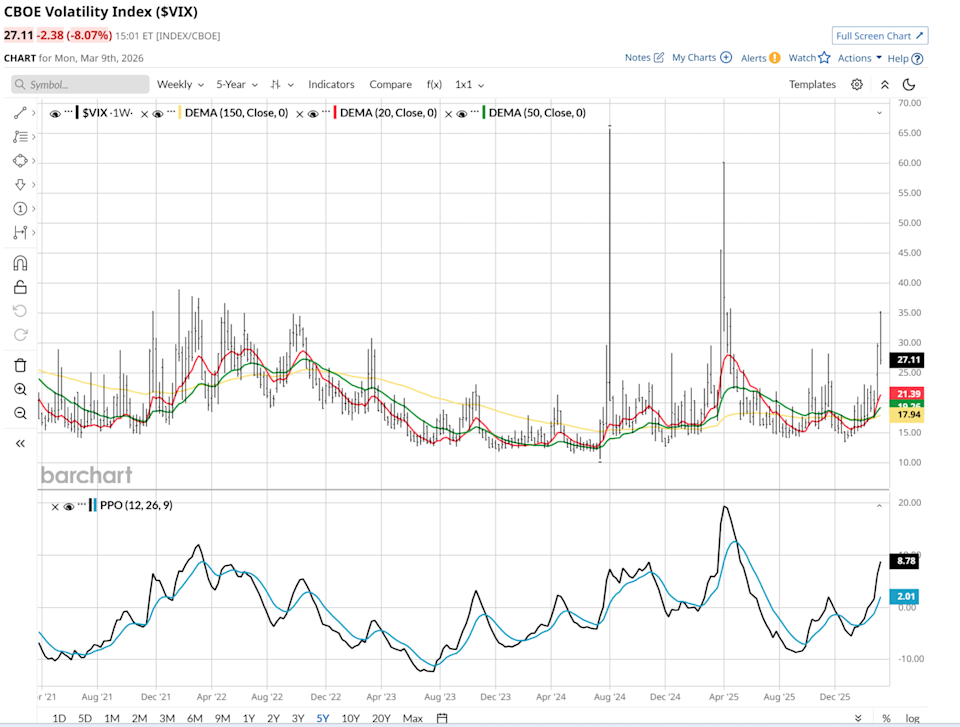 For college basketball fans, March Madness is later this month. But for investors in many parts of the stock market, March “badness” is already the headline-maker. I’m skipping over the daily chart of the CBOE Volatility Index ($VIX) since it can be very skittish. Here’s the weekly. Do you see what I see? It hit 30 for the first time since last April. But if that was the peak, unlike the last two times it carried that level, investors will have won a nice game of dodgeball. Dear Oracle Stock Fans, Mark Your Calendars for March 10 As Elon Musk Aims for AGI, Should You Buy Tesla Stock Now? Dear Vertiv Stock Fans, Mark Your Calendars for March 23 Markets move fast. Keep up by reading our FREE midday Barchart Brief newsletter for exclusive charts, analysis, and headlines. It means that the tranquil market has officially shattered. Now, that doesn’t mean the S&P 500 Index ($SPX), on which the VIX is based, is destined to crater any time soon. It implies that the market is set up for a much wider range of outcomes than it was a few weeks ago. So, this sudden spike is more than just a statistical outlier. It is a clear signal that the fear gauge has moved from a state of complacency into a high-risk zone. Historically, a VIX reading above 30 indicates heightened uncertainty and extreme investor fear. In this environment, the market is no longer pricing in smooth sailing but is instead bracing for potential supply-chain disruptions and geopolitical flashpoints. While these spikes are often short-lived and can present contrarian buying opportunities for long-term investors, the current momentum suggests that the path forward will be defined by continued whiplash. For those looking to capitalize on this movement, the exchange-traded fund (ETF) market offers two polar-opposite tools: the ProShares Ultra VIX Short-Term Futures ETF (UVXY) and the ProShares Short VIX Short-Term Futures ETF (SVXY). UVXY is a weapon for those who believe the chaos is just beginning. By providing 1.5x daily leveraged exposure to short-term VIX futures, UVXY is designed to deliver amplified returns during sudden market panics. When the S&P 500 falls, VIX typically rises, and so does UVXY. On Friday alone, as the VIX neared the 30 mark, UVXY surged by more than 10% as traders scrambled for downside protection. However, this is a highly tactical instrument. Its leveraged nature and the costs associated with rolling futures contracts mean it can lose value rapidly if the market stabilizes even slightly. It is intended for short-term bursts of hedging rather than a long-term hold. Personally, when I buy it, the clock starts ticking instantly for when I will sell it. If you do not like watching your ETF positions every day, UVXY is a tough one to own. That said, I also see it as a decent, albeit imperfect, surrogate for owning put options — without an expiration date, as options have. Conversely, SVXY is a tool for the market contrarian who believes the worst is over. SVXY offers inverse exposure to VIX futures, meaning it gains value when volatility declines and markets return to a state of calm. Essentially, SVXY provides a way to profit from the "volatility crush" that typically follows a peak of fear. While it carries its own significant risks, particularly if volatility continues to climb, it represents a stabilization bet in a landscape defined by current turmoil. The divergence between these two ETFs highlights the high-stakes choice facing investors. Whether pouncing on the continued upside of fear with UVXY or betting on a return to normalcy with SVXY, the key is understanding that these products are built for the current lightning-fast market environment. As the VIX hovers in this new territory, it is putting investors on notice. The buy-the-dip era is facing its most rigorous challenge yet. Rob Isbitts created the ROAR Score, based on his 40+ years of technical analysis experience. ROAR helps DIY investors manage risk and create their own portfolios. For Rob's written research, check out ETFYourself.com. On the date of publication, Rob Isbitts did not have (either directly or indirectly) positions in any of the securities mentioned in this article. All information and data in this article is solely for informational purposes. This article was originally published on Barchart.com