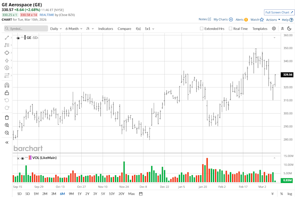 GE Aerospace (GE) is a global powerhouse in aviation, specializing in the design and manufacture of jet and turboprop engines and systems for commercial, military, business, and general aircraft. Known for pioneering the first American jet engine, it powers hits like Boeing (BA) 737s and Airbus (EADSY) A320s via the CFM International (with Safran (SAFRF)) joint venture and leads aftermarket services for 49,000+ engines. Born in 1892 as part of General Electric, it spun off independently in April 2024. The company is headquartered in Evendale, Ohio. Dear Oracle Stock Fans, Mark Your Calendars for March 10 As Elon Musk Aims for AGI, Should You Buy Tesla Stock Now? Dear Vertiv Stock Fans, Mark Your Calendars for March 23 Stop Missing Market Moves: Get the FREE Barchart Brief – your midday dose of stock movers, trending sectors, and actionable trade ideas, delivered right to your inbox. Sign Up Now! GE Aerospace has demonstrated remarkable strength over the past year, currently trading near its 52-week high of $348.48. While the stock has faced some short-term pressure with a five-day decline of approximately 2% due to broader market volatility, its longer-term momentum remains robust. Over the last month, the stock is up 4%, and its six-month gain of nearly 16% and a staggering 52-week surge of over 71% highlight significant investor confidence. Compared to the S&P 500 Industrials sector ($SRIN), GE has outperformed in the long term. Over the past 12 months, GE’s 71% return has more than doubled the 30% gain seen in the broader industrials sector. GE Aerospace delivered stellar Q4 2025 results on Jan. 22, 2026. The company posted adjusted earnings per share (EPS) of $1.57, which beat the analyst consensus estimate of $1.43 by approximately 10%. On the top line, adjusted revenue reached $11.9 billion, a 20% increase year-over-year (YoY), significantly outperforming the projected $11.27 billion. This growth was primarily driven by a surge in commercial orders and robust demand for aftermarket services as airlines continue to expand their global fleets. The company's operational efficiency remained a key highlight, with operating profit rising 14% to $2.3 billion for the quarter. While the adjusted operating profit margin saw a slight contraction to 19.2% (down 90 basis points) due to a higher mix of engine deliveries and increased R&D spending, the full-year margin expanded to a healthy 21.4%. GE Aerospace demonstrated exceptional cash generation, producing $1.8 billion in free cash flow (FCF) during the quarter, bringing the annual total to $7.7 billion. Additionally, the company maintained a strong balance sheet with a cash reserve of $12.4 billion, providing a solid cushion for future investments and shareholder returns. Looking ahead, GE Aerospace provided an optimistic outlook for the 2026 fiscal year, signaling that the momentum from 2025 will continue. For the full year, the company expects adjusted EPS in the range of $7.10 to $7.40 and FCF between $8.0 billion and $8.4 billion. GE Aerospace has announced a massive $1 billion investment into its American manufacturing facilities and supplier network for 2026. This significant spending follows a similar billion-dollar commitment from the previous year and is designed to tackle a massive backlog of jet engine orders for both commercial airlines and military programs. By upgrading these factories, the company aims to speed up production and ensure parts are delivered faster to customers like Boeing and Airbus. This expansion is a major win for the workforce, as it is expected to support approximately 5,000 additional jobs across the United States. The investment is strategically divided to strengthen different areas of the business, with over $275 million dedicated to military engine production and $200 million aimed at increasing the output of the popular CFM LEAP engine. To prevent delays further down the line, GE Aerospace is also allocating more than $100 million to help its suppliers buy the high-tech equipment they need to stay on schedule. Beyond these physical upgrades, the company remains committed to the future by spending roughly $3 billion annually on research and development to create the next generation of sustainable aviation technology. As GE stock continues on its upward trajectory, analysts have provided a consensus “Strong Buy” rating, an upgrade from a “Moderate Buy” rating two months ago. The stock has a mean price target of $360.74, reflecting an upside potential of 12% from the market price. GE stock has been studied by 20 analysts in total, with 16 “Strong Buy” ratings, two “Moderate Buy” ratings, one “Hold” rating, and one “Strong Sell” rating. On the date of publication, Ruchi Gupta did not have (either directly or indirectly) positions in any of the securities mentioned in this article. All information and data in this article is solely for informational purposes. This article was originally published on Barchart.com