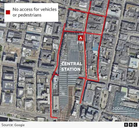 A huge blaze that engulfed a B-listed Victorian building in the centre of Glasgow on Sunday evening has left Scotland's busiest railway station shut down for days and destroyed dozens of businesses. Here is what we know so far about the fire and its aftermath. The fire started in a vape shop on Union Street at about 15:45 on Sunday, with firefighters being called soon afterwards. The blaze later engulfed the entire building which occupied the corner of Union Street and Gordon Street, next to Glasgow Central Station, causing it to partially collapse. The Scottish Fire and Rescue Service said six crews were initially sent to the four-floor building. Videos posted on X show smoke billowing out of a ground-floor vape shop next to a side entrance to the railway station. An eyewitness told BBC Scotland News that he tried to tackle the fire at the vape shop but had to abandon the attempt after a series of explosions. Lamin Kongira said he had been walking past when a shopkeeper ran out shouting "fire, fire". He said he ran into the shop, where he saw an adapter charging system - full of chargers - under the counter and a small fire. Lamin then went next door to the Subway sandwich shop to get help. He said he returned with a fire extinguisher and tried to fight the fire but he heard two explosions in the vape shop and had to turn around. He told the BBC he thought it was the second explosion that spread the fire to other parts of the building. During Sunday evening, the fire appears to have taken hold throughout the building. The flames reached the dome on the corner of the historic 19th Century building and the front wall collapsed to the ground. The fire service confirmed the fire broke out in a vape shop and said a preliminary multi-agency investigation had begun into the cause. Only the facade of the building at the corner of Gordon Street and Union Street is left standing. The building known as Union Corner, dates back to 1851, pre-dating the station which opened in 1879. At the height of the incident, 250 firefighters, 18 fire engines and specialist resources, including a high-volume pump drawing water from the River Clyde, were deployed to the scene. The SFRS said its response to the incident was scaled back on Monday with eight fire engines including three high-reach vehicles still on site. Fire crews used aerial platforms to hose water on to what remained of the building, as smoke hung in the air. Crews were working to cool off hotspots in the stonework and assist structural engineers in assessing the stability of the remaining building. The remaining facade of the building is now in a state of "ongoing and uncontrolled collapse", according to the city council. Business owners told BBC Scotland they remain "heartbroken" after dozens of retail units that were housed in Union Corner burnt to the ground. Courtney MacKinnon has run a hairdressing business called Cece's Salon in the building for the past four years. She said she had been left devastated by the destruction and did not know what the future would hold. "It's really shocking, the amount of small businesses that are gone," she said. "Everybody there works so hard, it's difficult for everyone. Everything seems to be gone." Alessandro Varese, who owns the well-known Blue Lagoon chip shop on Gordon Street and neighbouring Sexy Coffee, said both had been "completely destroyed". He said another branch of Blue Lagoon on Argyle Street was closed because of smoke damage, while an office on the third floor of the Gordon Street building had also been wrecked in the blaze. Varese said he wanted all of the business owners in the block to "stick together" and rebuild. First Minister John Swinney visited the scene on Monday and said the Scottish government would contribute financially to help the council. But there is no clear recovery plan for local businesses yet. Studios and expensive equipment were destroyed in the fire, and people have donated to fundraisers to help deal with the financial impact. Glasgow Central is one of the busiest stations in the UK, with 25 million passenger visits each year. It is the main station for all services on the west coast mainline to England and also operates services throughout central Scotland. ScotRail said no services would operate in or out of Central Station on Tuesday and warned that disruption would continue for several days. Low level trains will pass through the station to stop at nearby Argyle Street and Anderston stations. There will be limited replacement buses available for some services. ScotRail said it will update passengers on social media, on its website and on its app. Avanti West Coast said tickets dated between 8 and 13 March can be used at no extra cost on any Avanti West Coast train on the same route until Friday. "The majority of our trains between Scotland and London are able to run normally to/from Motherwell and Edinburgh," the train company said. "Our other routes, such as to Manchester, Liverpool, Birmingham, and North Wales are unaffected by this disruption." Police Scotland said several roads around Union Street and Central Station would remain closed. They are: First Bus Greater Glasgow said the fire and subsequent road closures had brought disruption to multiple services. Union Street, where the fire took place, is a main drop-off point for many city centre passengers. The station has been closed since Sunday but appears to have avoided any major damage. Network Rail said its staff and fire service teams were continuing to work on the site and disruption to services is expected to continue for the coming days. BBC Scotland News understands that Network Rail staff have now visited the station and believe there has not been serious damage inside the station itself. Engineers at the rail operator have been to the station concourse, and believe that it is in good shape. They have also visited the nearby Caledonian Chambers building, which apparently has not suffered major dam