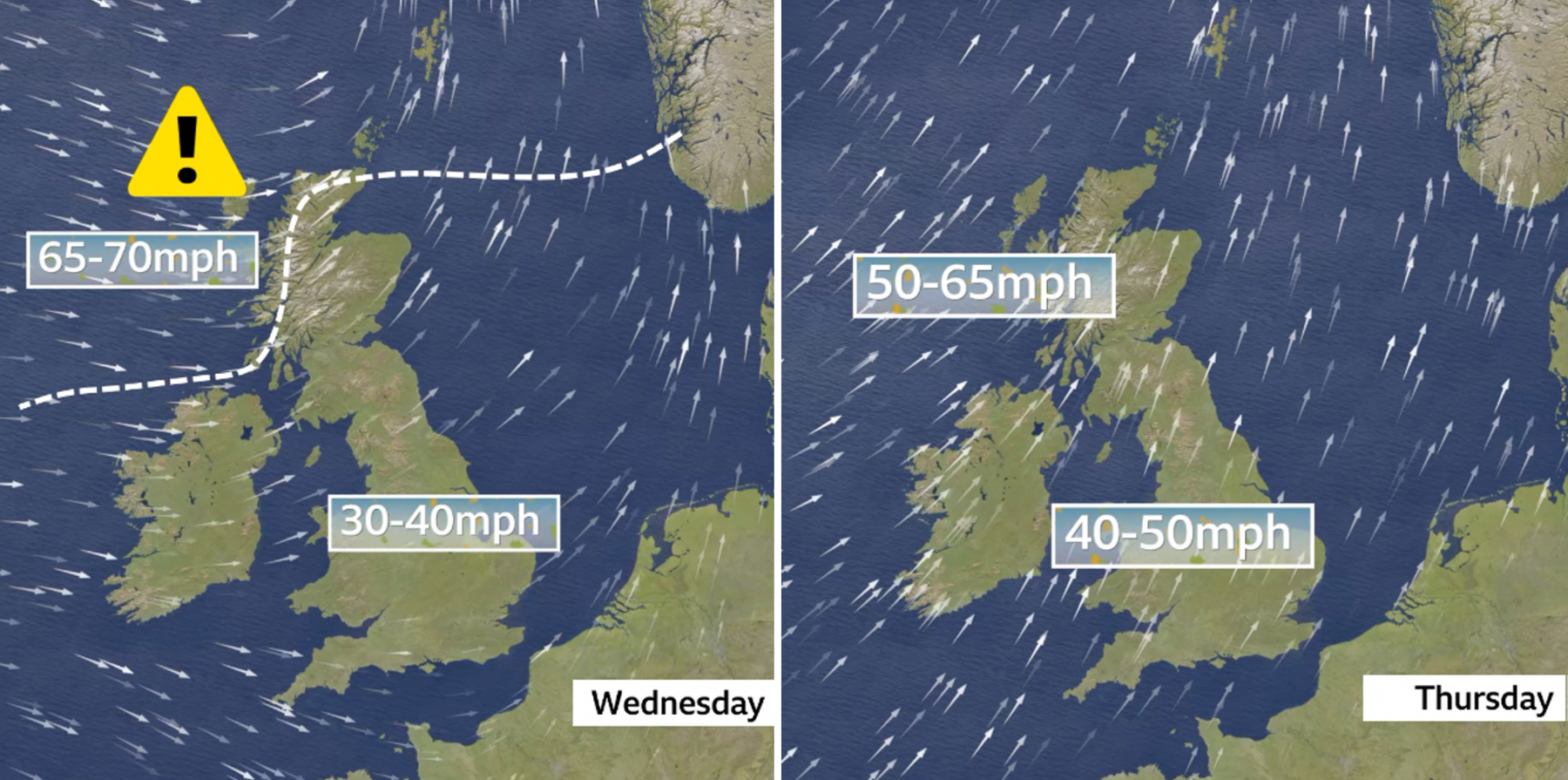 Some travel disruption is likely in the next few days as strenghtening winds develop across the United Kingdom. On Wednesday a Met Office yellow warning is in force for gusts up to 80mph (130km/h) expected across northern and western Scotland. But, it will turn more widely windy for most of us during Thursday. Temperatures will then drop into Friday with a return to some wintry weather, with snow on higher ground. Strong winds will develop on Wednesday and Thursday across parts of the UK A deepening area of low pressure between Scotland and Iceland on Wednesday is bringing strong westerly winds, gales and even touching severe gales. The Met Office has a yellow warning in force until 12:00 GMT in western and northern Scotland for gusts to reach 65-70mph (105-110km/h) and a small chance of up to 80mph (130km/h) in some locations. The strongest winds will initially be felt in the Outer and Inner Hebrides before spreading into northern mainland Scotland and Orkney later on. There could be some travel disruption such as cancelled ferries, flight delays and bridge restrictions for high-sided vehicles. While Wednesday will be a dry and bright day for most of the UK, there will be some frequent showers across Scotland. By Thursday the strongest winds across western Scotland will have eased but it will turn windy quite widely across the UK. Gusts of 40-50mph (65-80km/h) will be seen widely, up to 60mph (97km/h) around western coasts of England and Wales and 65mph (105km/h) in northern and western Scotland. We then need to keep an eye on the forecast for the weekend. Another deep area of low pressure will pass to the south of Iceland with strong winds on its southern flank across the UK. Northwesterly winds will drag in some colder air from the Arctic region on Friday On Friday a northwesterly wind will start to drag in some colder air from the Arctic region. Temperatures will therefore fall to around three or four degrees below average and with strong winds, it will perhaps make it feel much colder. Fast-moving hail showers are possible almost anywhere and brief flurries of wet snow are not out of the question, even in the south. However, snow is unlikely to settle there. Most of any accumulating snow is only really likely on the mountains and higher ground of Scotland, Northern Ireland and northern England. Some could also be possible in Wales and south-west England. There is the possibility of further wintry showers in the forecast for Sunday. Wet winter leads to 'extremely frustrating' grassroots football season UK winter not a record breaker despite floods and storms Comments can not be loaded To load Comments you need to enable JavaScript in your browser