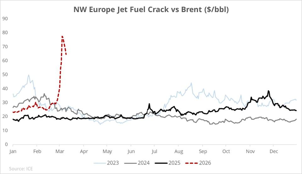The closure of the Strait of Hormuz since March 1 has triggered an unprecedented distortion in global jet fuel markets, pushing European aviation fuel prices to historic extremes and exposing the continent’s structural dependence on Middle Eastern supply. In a market where diesel has traditionally commanded a premium over jet fuel, the sudden disruption of Gulf exports has inverted long-standing price relationships, leaving Europe desperately searching for alternatives that are either geographically distant, commercially unattractive, or politically constrained. Historically, Europe’s refining system has been structurally tight in middle distillates, reflecting the continent’s diesel-heavy transport system. Diesel, therefore, almost always traded at a premium to jet fuel, with the European jet-diesel regrade typically fluctuating between about –$5 to +$2/bbl during a normal seasonal cycle. That relationship has now collapsed. Since the beginning of the price volatility due to the war in Iran, the regrade has surged to $45-48/bbl, when the ICE jet crack spread has peaked at roughly $78/bbl. While Singapore’s jet crack spread has eventually declined from a shocking last-week peak of $79 to $40/bbl, the European peak is still holding to $65-68/bbl levels, indicating a real structural shortage. The explanation lies primarily in supply disruption. Around 30% of Europe’s jet fuel imports normally arrive from the Gulf region, and with the Strait of Hormuz effectively closed, tankers loaded with aviation fuel remain trapped inside the Gulf. Related: Little-Known US Company Lands Important Pentagon Contract in Rare Earth Race The Gulf has long served as the world’s principal source of jet fuel exports, largely because its crude oil and refinery configuration generate abundant middle distillates. Among those suppliers, Kuwait has emerged as the dominant provider to Europe, at times covering roughly ¼ of European jet imports. In 2026, there were even weeks when European jet imports originated exclusively from Kuwait. Supply had already been temporarily constrained before the conflict escalated: the Al?Zour Refinery (about 610,000 b/d) , Kuwait’s largest, was offline for several months after a fire incident in October 2025.. By mid-February, however, exports from Kuwait had returned to normal volumes and loading activity intensified as tensions between the US/Israel and Iran escalated. Cargoes were increasingly stored in independent terminals in the ARA hub, pushing jet inventories along the Western European coast to roughly 950,000 tonnes (7.5 million barrels) before hostilities began. Kuwait’s presence in Europe extends far beyond cargo trade. Kuwait Petroleum Corporation controls Kuwait Petroleum International, whose Q8 network includes roughly 4,500 retail stations across Italy, Belgium, the Netherlands, Denmark and Sweden, while supplying aviation fuel across much of Western Europe. Kuwait also jointly operates the Milazzo Refinery (around 200,000 b/d) with Eni. Yet the Hormuz closure effectively isolates Kuwait’s export infrastructure inside the Gulf, forcing the country to curb production because crude and refined products cannot be shipped outward. The UAE and Bahrain face similar logistical blockages, as their refining systems are likewise concentrated along the Gulf coast. Related: No Magnets, No Drones: How China Controls the Future of Warfare Among regional Gulf producers, Saudi Arabia is the only major supplier with a partial alternative route via its Red Sea coastline. However, structural bottlenecks limit Riyadh’s ability to redirect volumes westward. Crude would need to move through the East?West Pipeline, whose 5 million b/d capacity represents only about half of Saudi Arabia’s 10-11 million b/d production capability. The Red Sea hub around Yanbu is historically optimized for crude export rather than refined product shipments, while nearby refineries have largely served domestic or intra-regional demand. If Gulf supply is constrained, the theoretical alternatives lie in China, South Korea, the United States, and India – the world’s largest jet fuel exporters outside the Gulf. In practice, each faces significant limitations. China remains geographically distant from Europe, and freight rates have surged since the Hormuz disruption. Transporting jet from Chinese ports to the ARA hub now costs around $8–9/bbl, roughly double the $4–5/bbl seen previously in pre-war times. Chinese exporters also prioritize regional buyers such as Japan, Malaysia and the Philippines, while Australia alone imported roughly 45–50 kb/d of Chinese jet fuel last year. Adding to the constraints, Beijing has imposed an April suspension on most refined-product exports, tightening Asian supply. The measure does not fully prohibit jet fuel shipments (bonded exports for departing aircraft and deliveries to Hong Kong and Macau remain allowed) but it still reduces the availability of export volumes. South Korea, another major exporter, faces little incentive to redirect cargoes to Europe either. The country shipped around 120–130,000 b/d of refined products to California last year, supplying a market with exceptionally tight fuel specifications and strong premiums. Other major buyers – Japan, Australia, New Zealand, China and the Philippines – are located nearby, making long-distance shipments to Europe commercially unattractive. The US offers little relief. Beyond the long freight distance, American refiners prioritize domestic aviation demand and supply much of North and Central America, exporting jet fuel mainly to Mexico, Canada, and Panama – markets structurally dependent on US supply. India also appears to be an unlikely solution. Much of its refinery output is about to be increasingly derived from Russian crude, and the EU’s restrictions on products made from Russian barrels make large-scale imports politically complicated even if they were commercially viable. One p