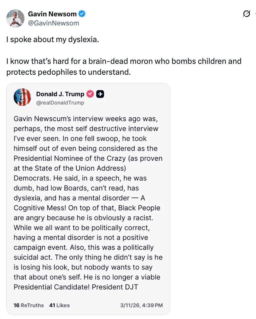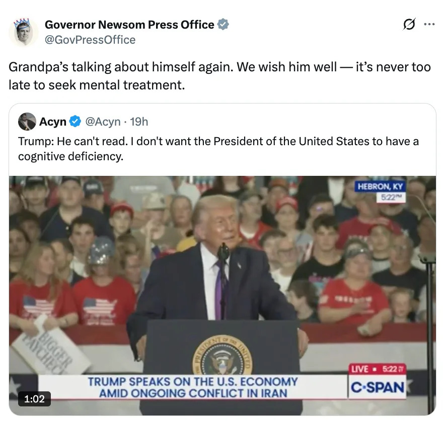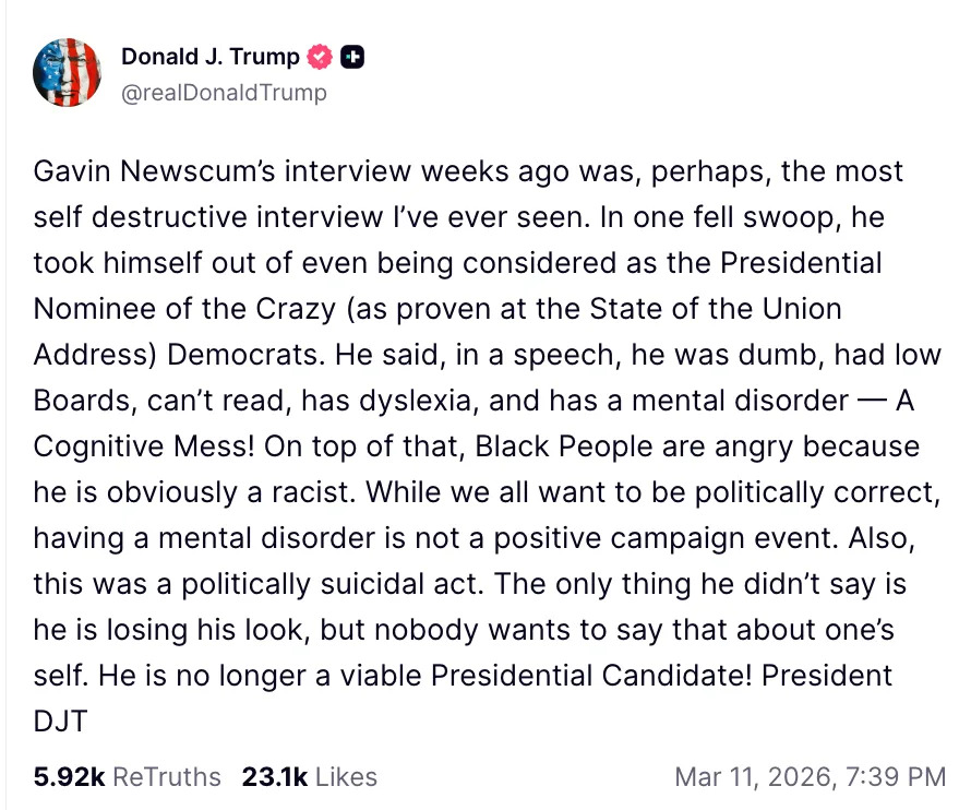 undefined Related: "Good Riddance": Kristi Noem Has Been Fired As Head Of DHS, And Yeah, The Internet's Got Jokes Related: Hillary Clinton Just Hit On One Of Donald Trump's Biggest Insecurities With Three Words Related: Erika Kirk Was Asked If She Plans To Endorse JD Vance For President In 2028, And Things Got A Little...Awkward CSPAN/Acyn/Twitter: @AcynTrump brought Newsom up again at his Kentucky rally, saying, "He admitted he has mental problems. That he's not a smart person. That he has mental — a mental lack of ability. He’s unable to read a speech, he can’t read, and all of the other things he said. He said he has a lot of mental problems."— Acyn (@Acyn) March 11, 2026Trump: Newsom had admitted he has mental problems, that he's not a smart person, that he’s unable to read a speech. He can't read. I don't want the president of the United States to have a cognitive deficiency. pic.twitter.com/TadARABxPX Related: "Who's Gonna Tell Him": This Fox News Host Tried To Drag Gavin Newsom, And It Backfired In The Funniest Way Thoughts??? You Might Like: Being Alive Is Expensive, Here’s A List Of 38 Affordable Products That Will Help Make Being A Human A Little Easier You Might Like: Between You And Me, These 34 Products Will Solve Some Of Your Most Kinda-Embarassing Problems Also in In the News: JD Vance Made A Really Gross Joke Involving His Own Penis, And Usha Vance's Face Has Me On The Floor Read it on BuzzFeed.com