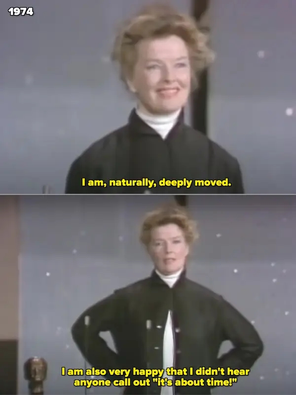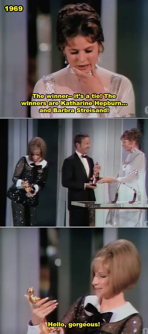 I still can't believe there have only been six ties in nearly 100 years of Oscars history. I’m the Editorial Director at BuzzFeed — where I’ve reported on TV, film, and lifestyle trends (primarily travel, fitness, and food) since 2013 — and I also post about the latest in pop culture news to my 850k+ followers on TikTok. Here are Fredric March (on the right) and Wallace Beery (on the left) at their ceremony, Oscars in hand. In a 1969 clipping from The Hollywood Reporter, Gregory Peck said, “There is no studio pressure in any phase of the Academy’s activities. There are loyalties and advocacies, of course, but pressure, no. It’s impossible. We’re not dependent on the studios. We’re not under any obligation to them. They have no leverage at all on the Academy.” The above photo is from Kate Hepburn's only appearance in Academy Awards history. It was in 1974, and she presented Lawrence Weingarten with the Irving G. Thalberg Memorial Award. Upon approaching the stage, she joked, "I am very happy that I didn't hear anyone call out 'it's about time!'"