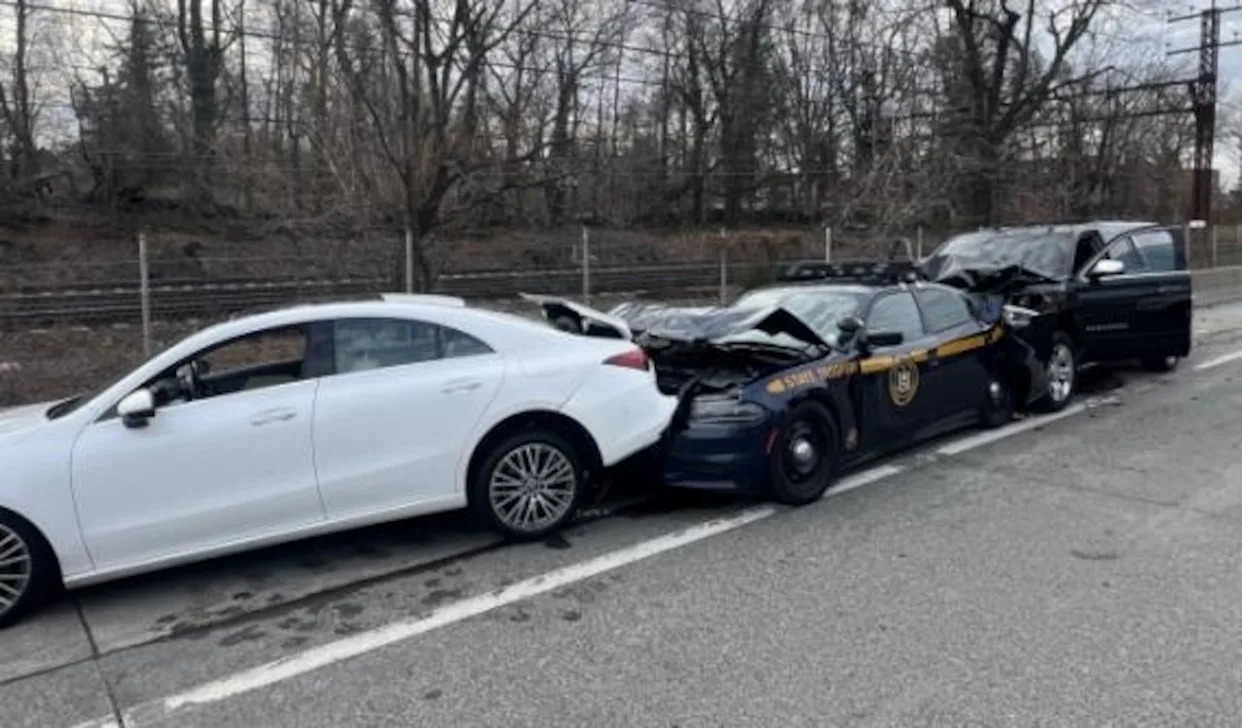 A New York State Police trooper sustained minor injuries after being struck during an early morning traffic stop on the Thruway in Westchester County. Two troopers were conducting a traffic stop on a 2025 Mercedes sedan along the right shoulder shortly after 5 a.m. on Sunday in Mamaroneck. The Mercedes was operated by Siiyer W. Walker, 52, of Connecticut. While the troopers were standing near the Mercedes, a 2007 Chevy Suburban operated by Kevin Ariel Cunache Moyolema, 24, of Connecticut, rear-ended the patrol car. The impact pushed the patrol car into the Mercedes, which then struck one of the troopers. The injured trooper was transported to Westchester Medical Center for treatment of minor injuries and was later released. The second trooper was not struck. Moyolema was transported to Westchester Medical Center for evaluation of minor body pain. Walker was evaluated by emergency medical services at the scene but declined transport to a hospital. The investigation is continuing. Read the original article on syracuse.com. Add syracuse.com as a Preferred Source by clicking here.