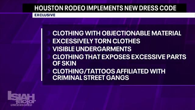 The Brief The Houston Rodeo has announced a new dress code policy for all patrons who attend the rodeo as part of its updated code of conduct. The new dress code will take effect immediately, according to rodeo officials. HOUSTON - The Houston Rodeo has announced a new dress code policy for all patrons who attend the rodeo as part of its updated code of conduct. The new dress code will take effect immediately, according to rodeo officials. According to the new dress code: Proper attire must be worn on HLSR Show grounds at all times, including shirts and appropriate footwear. HLSR reserves the right to deny admission to or remove any person wearing attire that is considered inappropriate or attire that could detract from the experience with other guests. Clothing that is not appropriate for the HLSR Show grounds includes, but is not limited to, clothing with objectionable material (including obscene language or graphics), excessively torn cloth, visible undergarments, and/or clothing which, by nature, exposes excessive portions of the skin that may be viewed as inappropriate for a family environment. Wearing clothing, visible tattoos or any other attire bearing the name, insignia, colors, or other indicia of affiliation to a criminal street gang is prohibited on HLSR Show grounds. No clothing or apparel that intentionally obscures the face is permitted unless worn for cultural or religious reasons or a medical condition. What they're saying According to rodeo officials, "This is a family-friendly event, and we expect guests to act accordingly, including wearing appropriate attire and demonstrating behavior that reflects the spirit of the Rodeo. To reinforce that expectation, we have updated our dress code within our fan code of conduct. Every guest agrees to this code when purchasing a ticket to the Houston Livestock Show and Rodeo, and it is also clearly available on our website. The Houston Livestock Show and Rodeo is a family-friendly event, and we want every guest, especially young people, to have a safe and memorable experience. We will not allow disruptive behavior or inappropriate attire to take away from the experience that millions of families come here to enjoy." Click here to view the full updated code of conduct for the Houston Rodeo. Big picture view The 2026 Houston Livestock Show and Rodeo competition will continue until Saturday, March 21, when Tim McGraw will take to the star stage. On Sunday, March 22, Cody Johnson, with special guests Jon Pardi & Randy Houser, will perform a full-length concert. There will be no RodeoHouston competitions, however, the grounds will be open, including the carnival, wine garden, dining, shopping and more. The Source Houston Livestock Show and Rodeo