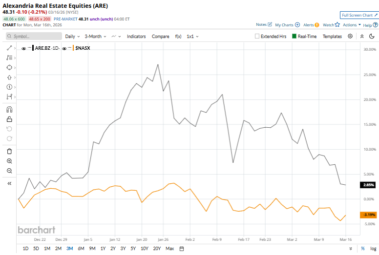 Based in Pasadena, California, Alexandria Real Estate Equities, Inc. (ARE) is a leading real estate investment trust (REIT) that develops and manages campuses in key innovation markets across the U.S. Specializing in the life sciences sector, the company creates collaborative workspaces designed to foster research and development. Companies valued at less than $10 billion are generally considered “mid-cap” stocks, and the REIT, with a market capitalization of $8.4 billion, fits perfectly into that category. Alexandria Real Estate Equities stands out due to its focused dominance in the highly specialized life sciences real estate sector, where it develops and leases complex lab and research facilities that are difficult to replicate. Its properties are concentrated in top innovation hubs like Boston and San Francisco, ensuring strong, sustained demand. The company benefits from long-term leases with high-quality biotech and pharmaceutical tenants, providing stable and predictable cash flows. What Options Traders Expect from Micron Stock After Earnings on March 18 Stocks Set to Open Higher as Bond Yields Fall, Fed Meeting and Middle East Conflict in Focus This Dividend King With a 54-Year Dividend Streak Is Down 13% YTD. Time to Buy the Dip? Stop Missing Market Moves: Get the FREE Barchart Brief – your midday dose of stock movers, trending sectors, and actionable trade ideas, delivered right to your inbox. Sign Up Now! Alexandria Real Estate has been under significant pressure, with its shares currently trading at a steep 52.3% below their 52-week high of $101.21. Over the past three months, the stock has surged 2.9%, outpacing the broader Nasdaq Composite’s ($NASX) fall of 3.2% over the same time frame. Over the past year, ARE has plunged 51.3%, and has dropped 43.7% over the past six months, sharply contrasting the S&P 500’s 26% and marginal rise over the same periods, respectively. Technical indicators reinforce this bearish trend, as the stock has remained below its 200-day moving average for over a year and slipped under its 50-day moving average early this month. On Feb. 10, Alexandria Real Estate Equities shares rose 1.2% after the company priced a $750 million public offering of 5.25% senior notes due 2036. The notes were issued at a slight discount with a 5.291% yield and are unsecured, backed by its subsidiary. ARE plans to use the proceeds primarily to repay existing debt tied to a prior tender offer, while temporarily allocating funds to short-term investments or general corporate purposes. ARE has trailed its key competitor, BXP, Inc. (BXP), which has declined 20.2% over the past 52 weeks and 33.8% over the past six months. Wall Street analysts are tepid on ARE’s stock. The stock has a consensus rating of “Hold” from the 17 analysts covering it. The mean price target of $59.64 indicates a 23.5% upside compared to current levels. On the date of publication, Kritika Sarmah did not have (either directly or indirectly) positions in any of the securities mentioned in this article. All information and data in this article is solely for informational purposes. This article was originally published on Barchart.com