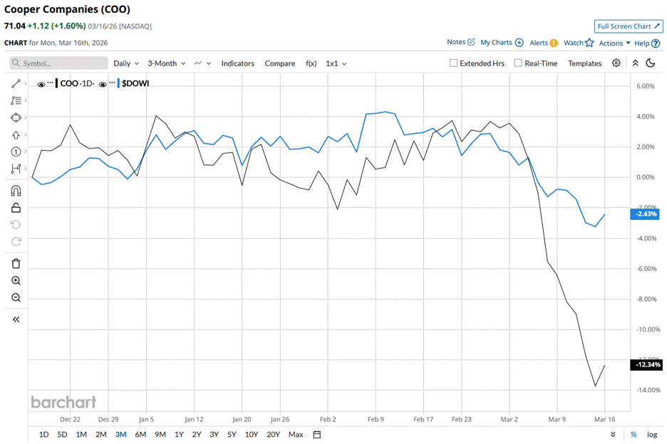 The Cooper Companies, Inc. (COO), based in California, develops, manufactures, and markets contact lens wearers. Valued at a market cap of $13.9 billion, the company operates in two segments, CooperVision and CooperSurgical. COO offers spherical, toric, and multifocal contact lenses, fertility products and services, medical devices, contraception, and cryostorage for women. Companies with a market capitalization of $10 billion or more are typically referred to as "large-cap stocks." COO fits right into that category, with its market cap exceeding this threshold, reflecting its substantial size and influence in the medical instruments and supplies industry. What Options Traders Expect from Micron Stock After Earnings on March 18 This Dividend King With a 54-Year Dividend Streak Is Down 13% YTD. Time to Buy the Dip? Stocks Set to Open Higher as Bond Yields Fall, Fed Meeting and Middle East Conflict in Focus Markets move fast. Keep up by reading our FREE midday Barchart Brief newsletter for exclusive charts, analysis, and headlines. However, COO stock is down 20.9% from its 52-week high of $89.83 touched on Dec. 05, 2025. Moreover, Cooper Companies has been on a downward trajectory lately, declining 12.3% over the past three months and lagging behind the Dow Jones Industrials Average ($DOWI), which declined 2.4% during the same period. Zooming out a little further, the scenario remains the same. Over the past 52 weeks, COO has declined 12.5%, lagging behind the DOWI’s 13.2% gain. COO has been trading below its 200-day and 50-day moving averages since the start of this month, showcasing a bearish momentum. On Mar. 5, COO shares declined 2.2% following the release of its mixed Q1 2026 earnings. The company’s revenue increased nearly 6% year-over-year to $1 billion and came in line with the Street’s estimates. Moreover, its adjusted EPS for the quarter rose 20% from the prior year’s quarter to $1.10, which successfully beat Wall Street estimates. However, investors were more keen on keeping an eye on the company’s weak organic revenue growth and its slower business in the Asia Pacific region, owing to ongoing challenges. COO stock dropped another 4.6% in the next trading session, as a result of declining investor confidence. When stacked against its peer, Align Technology, Inc. (ALGN), COO has underperformed. Over the past year, ALGN stock has grown 2%. Additionally, sentiment on COO remains moderately optimistic. Among the 18 analysts covering the stock, the consensus rating is a “Moderate Buy.” Its mean price target of $90.81 suggests 27.8% upside potential from current price levels. On the date of publication, Sristi Jayaswal did not have (either directly or indirectly) positions in any of the securities mentioned in this article. All information and data in this article is solely for informational purposes. This article was originally published on Barchart.com