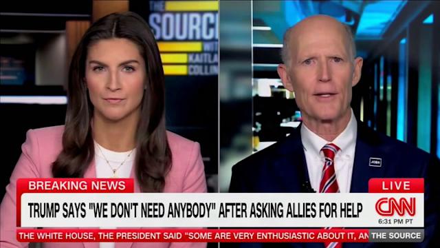 One of Donald Trump’s wealthiest surrogates in Congress struggled to say how and when the administration would rein in spiraling gas prices with traffic in the vital Strait of Hormuz at a standstill thanks to the president’s war with Iran. “Well, it’ll open eventually. I mean, eventually it’s going to open,” Sen. Rick Scott told CNN’s Kaitlan Collins. Asked how long that could be, the Florida Republican pivoted to a bizarre justification of the war, which has not been approved by Congress.