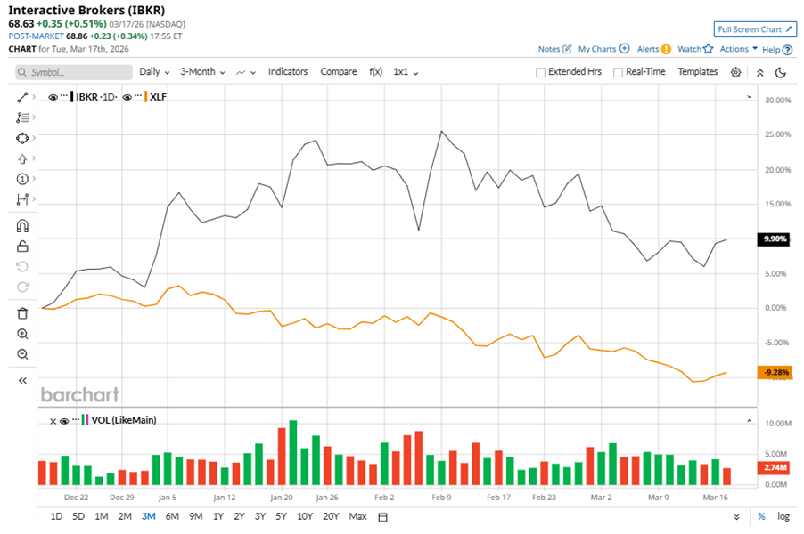 Greenwich, Connecticut-based Interactive Brokers Group, Inc. (IBKR) operates as an automated electronic broker. Valued at $115.8 billion by market cap, the company specializes in executing and clearing trades in stocks, options, futures, foreign exchange instruments, bonds, mutual funds, and exchange-traded funds, as well as offers custody, prime brokerage, securities, and margin lending services. Companies worth $10 billion or more are generally described as “large-cap stocks,” and IBKR perfectly fits that description, with its market cap exceeding this mark, underscoring its size, influence, and dominance within the capital markets industry. IBKR's strengths include tech-driven efficiency, global reach, low costs, and a diversified client base. Its in-house platform drives innovation and attracts customers, with strong financial backing. As Oracle Reveals Higher Restructuring Costs, Should You Still Buy ORCL Stock or Stay Far Away? Stop Fighting Time Decay: How Credit Spreads Change the Game for Options Traders Stocks Climb on Strength in Chip and Travel Stocks Get exclusive insights with the FREE Barchart Brief newsletter. Subscribe now for quick, incisive midday market analysis you won't find anywhere else. Despite its notable strength, IBKR slipped 13.3% from its 52-week high of $79.18, achieved on Feb. 10. Over the past three months, IBKR stock gained 9.9%, outperforming the State Street Financial Select Sector SPDR ETF’s (XLF) 9.3% losses during the same time frame. Shares of IBKR rose 10.1% on a six-month basis and climbed 57.4% over the past 52 weeks, outperforming XLF’s six-month dip of 8.4% and 1% return over the last year. To confirm the bullish trend, IBKR has been trading above its 200-day moving average over the past year, with slight fluctuations. However, the stock is trading below its 50-day moving average since late February, with minor fluctuations. IBKR's strong performance is driven by over 1 million net new accounts in 2025, more than $780 billion client assets, and higher trading activity across equities, options, and futures. The company’s CEO Milan Galik credits tech, fair pricing, and global access for attracting clients. On Jan. 20, IBKR shares closed down by 2.5% after reporting its Q4 results. Its net revenue stood at $1.6 billion, up 18.5% year over year. The company’s adjusted EPS increased 27.5% from the year-ago quarter to $0.65. IBKR’s rival, Robinhood Markets, Inc. (HOOD) has lagged behind the stock, with a 34.8% loss on a six-month basis, but outpaced the stock with a 84.1% uptick over the past 52 weeks. Wall Street analysts are bullish on IBKR’s prospects. The stock has a consensus “Strong Buy” rating from the eight analysts covering it, and the mean price target of $84.43 suggests a potential upside of 23% from current price levels. On the date of publication, Neha Panjwani did not have (either directly or indirectly) positions in any of the securities mentioned in this article. All information and data in this article is solely for informational purposes. This article was originally published on Barchart.com