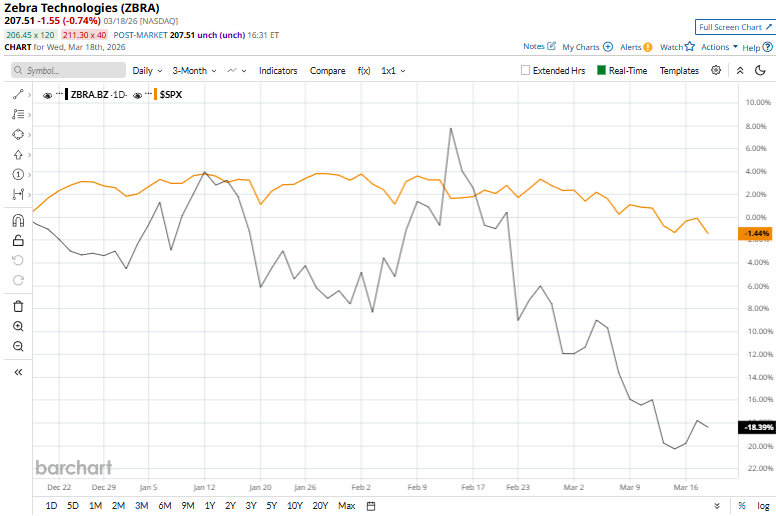 Valued at a market cap of around $10.3 billion, Zebra Technologies Corporation (ZBRA) is a leading technology company that specializes in enterprise asset intelligence and automatic identification and data capture solutions. The Illinois-headquartered company designs, manufactures, and sells a broad portfolio of products and software, including barcode scanners, RFID readers, mobile computers, and specialty printers for labels, receipts, and cards. Companies valued at $10 billion or more are generally classified as “large-cap” stocks, and Zebra Technologies fits right into that category. Its core competencies center on enterprise asset intelligence and automation. The company excels in data capture technologies, including barcode scanners, RFID solutions, mobile computers, and machine vision systems, that enable real-time tracking of assets, inventory, and workflows. It pairs this hardware strength with integrated software and analytics platforms that convert operational data into actionable insights, improving visibility and decision-making across supply chains. Following the Fed's Rate Decision, the S&P 500 and Dow Fall to New Closing Lows for 2026 As Tesla Gears Up to Launch Terafab, Is TSLA Stock a Buy? Should You Buy Datavault Stock Before March 19? Our exclusive Barchart Brief newsletter is your FREE midday guide to what's moving stocks, sectors, and investor sentiment - delivered right when you need the info most. Subscribe today! ZBRA has faced challenges over the past year, and the stock is trading 41.2% below its 52-week high of $352.66, which it hit on July 31. The stock has declined 17.9% over the past three months, underperforming the S&P 500 Index’s ($SPX) 3.1% fall. Zooming out, ZBRA is down 35.7% over the past six months and 26.6% over the past 52 weeks. In comparison, the $SPX has dropped marginally and gained 16.7% over the past year. The stock has been mostly trading below the 50-day and 200-day moving averages since August 2025. Shares of Zebra Technologies fell 5.1% on Feb. 23, following renewed trade policy uncertainty after the U.S. administration imposed fresh global tariffs under the Trade Act of 1974. The move raised concerns about potential disruptions to global supply chains and increased costs, which are particularly relevant for Zebra given its reliance on international manufacturing and distribution. ZBRA has underperformed its rival, Trimble Inc. (TRMB), which gained 77.9% over the past six months and 190.5% over the past year. However, the stock has a consensus rating of “Moderate Buy” from 17 analysts in coverage. The mean price target of $347.21 indicates a potential 67.3% upside from the current market prices. On the date of publication, Kritika Sarmah did not have (either directly or indirectly) positions in any of the securities mentioned in this article. All information and data in this article is solely for informational purposes. This article was originally published on Barchart.com