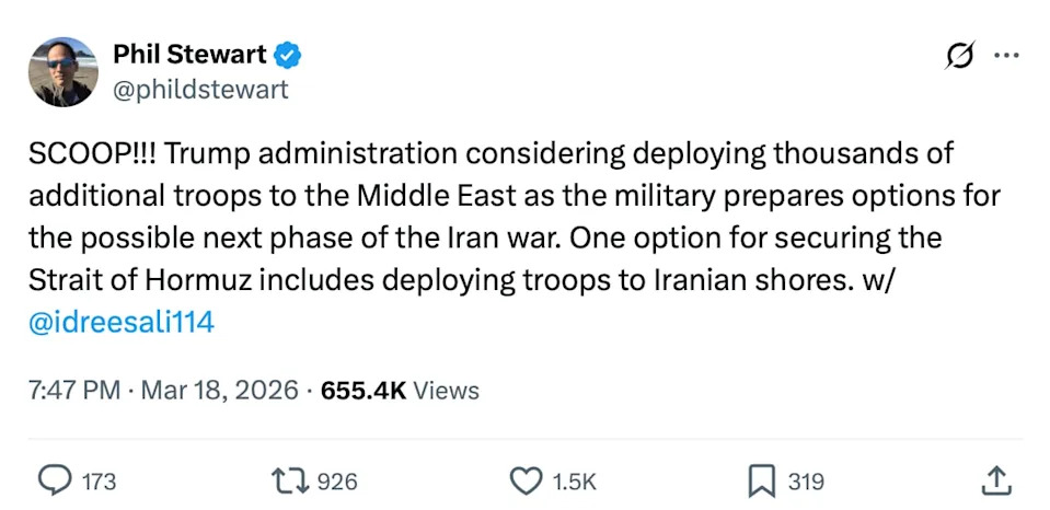 The Trump administration is considering escalating its war against Iran after having asked for a stunning amount of funding from Congress. As the administration continues to struggle to gain control of the Strait of Hormuz after nearly three weeks of war, it is looking into the possibility of actually sending U.S. forces onto the Iranian coast, Reuters reported Wednesday. The administration is now “considering deploying thousands of additional troops to the Middle East as the military prepares options for the possible next phase of the Iran war,” Reuters’ chief national security reporter, Phil Stewart, wrote on X. “One option for securing the Strait of Hormuz includes deploying troops to Iranian shores,” he added. The Straight of Hormuz is a critical shipping route that sees the passage of about a fifth of global oil supplies. After the U.S. and Israel launched strikes at Iran on Feb. 28, Iran closed the strait, and the threat of mines and other forms of attack have curtailed traffic. Trump administration officials have refused to rule out a boots-on-the-ground approach in the war. The Wall Street Journal reported last week that 5,000 Marines were being sent to the region as part of an “Amphibious Ready Group.” The U.S. death toll is currently 13. Defense Secretary Pete Hegseth earlier this month lashed out at the press for what he claimed was an attempt to focus too much on casualties to make Trump “look bad.” Meanwhile, the war’s price tag continues to rise. The Pentagon has asked the White House to request more than $200 billion in funding from Congress, the Washington Post reported. The Pentagon had considered several funding requests since the war began, a senior administration official and three others familiar with the matter said. Deputy Defense Secretary Steven Feinberg led that effort. The war cost approximately $11.3 billion in just the first week. With 60 votes needed in the Senate to approve war funding, the Trump administration will need support from some Democrats who have largely opposed the war. The administration official told the Post that some White House officials think the Pentagon is asking for too much. By contrast, by last December, the U.S. had approved about $188 billion in Ukraine aid, according to the U.S. special inspector general for that operation. Russia invaded Ukraine in February 2022. The U.S. and Israel first struck Iran less than three weeks ago. The Daily Beast has contacted the White House and the Pentagon for comment. The Trump administration on Tuesday saw its first resignation over the war. Joe Kent, who had led the National Counterterrorism Center, wrote that he “cannot in good conscience support the ongoing war in Iran.” “Iran posed no imminent threat to our nation, and it is clear that we started this war due to pressure from Israel and its powerful American lobby,” he added, contradicting Trump and other senior officials.