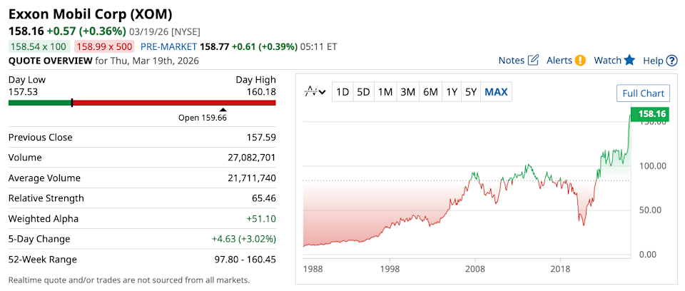 The war in Iran and rising oil prices are driving up pump prices. The problem is that oil is an integral part of transportation, manufacturing, and other essential parts of the economy; it helps keep everything moving. While inconvenient, it certainly raises a question about energy stocks and whether now is the right time to cycle in. And when investors look for big names in the sector, Exxon Mobil and Chevron are usually at the top of the list. Both are oil giants, but their approach is somewhat different. But how different, exactly? And how does that difference factor into which stock is a better choice for income investors? Stop Missing Market Moves: Get the FREE Barchart Brief – your midday dose of stock movers, trending sectors, and actionable trade ideas, delivered right to your inbox. Sign Up Now! Let’s find out. First is Exxon Mobil, the larger of the two companies. It operates in oil production, refining, and chemicals, giving it one of the strongest footholds in the energy market. With a market cap of around $656 billion, it is one of the biggest energy companies in the world. ExxonMobil stock is trading at approximately $158, and it is up nearly 37% year-to-date. Second is Chevron, nearly half the size of its rival, but still one of the most recognizable names in the sector. Like Exxon Mobil, it operates in oil and gas production and refining. With a market cap of around $396 billion, Chevron remains one of the largest energy companies in the world. Chevron stock is trading at about $201, and it is up roughly 32% year to date. Exxon makes money from producing oil and gas, refining crude into fuels and other products, and selling petrochemicals. It has a great presence on the value energy chain, which makes its positioning more balanced. So in short, Exxon produces, processes, and sells oil-based products. Meanwhile, Chevron is very similar, but with a slightly different emphasis. It also produces oil and gas and operates in refining, but its business is generally more centered on production than Exxon's. This difference gives Chevron a somewhat simpler setup while also tying it more closely to the ups and downs of oil and gas prices. Put simply, Exxon looks more balanced across the energy chain, while Chevron is more closely tied to production. Here’s what the numbers look like based on their latest financial reports: Metric (Latest quarter) Exxon Mobil Chevron Sales $82.3 billion $46.9 billion Net Income $6.5 billion $2.8 billion Operating Cash Flow $52.0 billion $33.9 billion Forward Price/Earnings (P/E) 22.54 27.32 Right away, last quarter, we can see Exxon has more sales, coming in at $82.3 billion, well ahead of Chevron’s $46.9 billion. Not only that, but net income is also higher for Exxon at $6.5 billion versus Chevron’s $2.8 billion. Cash flow tells pretty much the same story. Operating cash flow, a metric that tells how much cash a company generates from its core business operations, favors Exxon with roughly $52 billion, compared with Chevron’s $33.9 billion. Now let's talk valuation. The price-to-earnings ratio, or P/E, compares a company’s stock price with its earnings, helping investors decide whether a stock is expensive, cheap, or reasonably priced. Lower is generally better, but it only really means something when compared with the broader sector. The energy sector has a median forward P/E of around 16. As a result, both stocks look expensive based on that metric, though Exxon looks a bit cheaper than Chevron. This may be because investors are willing to pay a premium now, expecting solid performance going forward. Overall, if you are looking for the better value play between the two, Exxon appears to be the better buy because it has a lower P/E ratio and stronger results across sales, earnings, and cash flow. For income-focused investors, this is what you might be waiting for. Exxon pays a forward annual dividend of $4.12, translating to a yield of around 2.6%. It has a dividend payout ratio of 56%, meaning it pays out only 56% of its earnings to shareholders. The company has increased dividends for 43 consecutive years, and payouts have increased 15% over the last five years. Meanwhile, Chevron pays $7.12 yearly, translating to an approximate 3.5% yield. That’s almost 1% higher than Exxon. Chevron has also increased its dividend for 39 consecutive years and boasts a higher 5-year increase at 33%. However, all this comes with an astronomically high dividend payout ratio of 95%. Based on the dividend data, I’m leaning more towards Exxon as it has far more room to grow the dividend in the future. The yield and growth are lower, yes, but the company has a much bigger headroom to continue and increase its dividends more reliably. So, how does Wall Street rate these stocks? A consensus among 28 analysts rates Exxon a Moderate Buy” with an average score of 3.89 out of 5. The $186 high target price suggests up to 18% potential upside. On the other hand, a consensus of the same number of analysts rates Chevron a “Moderate Buy,” with a slightly higher average score of 4.04. The high target price of $242 suggests a 20% upside potential. When all is said and done, both Exxon and Chevron look like solid picks in the energy sector. And frankly, the better stock depends on what matters more to you. Exxon stands out for its larger scale, stronger financial results, and a better ability to grow its dividend in the future. It also has a broader business mix, which gives it a more balanced setup across different parts of the energy market. Meanwhile, Chevron could look better to investors who place a greater premium on higher yield today, at the expense of reduced dividend growth in the future. On the date of publication, Rick Orford did not have (either directly or indirectly) positions in any of the securities mentioned in this article. All information and data in this article is solely for informational purposes. This article was originally published 