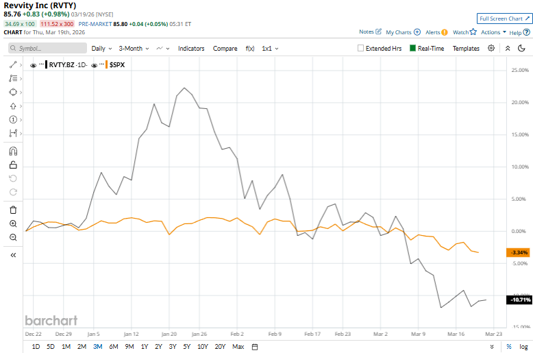 Massachusetts-based Revvity, Inc. (RVTY) is a global life sciences and diagnostics company that provides instruments, reagents, software, and services to support drug discovery, clinical research, and medical diagnostics. Valued at $9.5 billion by market cap, the company focuses on translational multi-omics technologies, biomarker identification, imaging, prediction, screening, detection, diagnosis, informatics, and other areas. Companies worth $10 billion or more are generally described as “large-cap stocks,” and RVTY perfectly fits that description, with its market cap exceeding this mark, underscoring its size, influence, and dominance within the diagnostics & research industry. Revvity is a specialized life sciences and diagnostics platform with a diversified product suite and recurring revenue streams, positioned to benefit from structural growth in biotechnology, precision medicine, and global healthcare demand. As Meta Stock Dips Near $600 Levels Should You Buy or Stay on the Sidelines? SoFi Stock Is on Fire Sale, But Is It Too Cheap to Buy Here? CoreWeave Stock Forecast: Buy, Sell, or Hold? Tired of missing midday reversals? The FREE Barchart Brief newsletter keeps you in the know. Sign up now! Despite its notable strength, RVTY slipped 27.5% from its 52-week high of $118.30, achieved on Jan. 22. Over the past three months, RVTY stock has gained 10.9%, underperforming the S&P 500 Index’s ($SPX) 3.3% fall. In the longer term, shares of RVTY rose 1.1% on a six-month basis but dipped 22% over the past 52 weeks, compared to SPX’s marginal six-month gains and 16.4% returns over the last year. To confirm the bearish trend, RVTY has been trading above its 50-day and 200-day moving averages since last month. On Feb. 23, Revvity shares declined 2.9% in the morning session after the Trump administration announced new global tariffs, reviving trade policy uncertainty. The move, which imposed a 15% tariff under the Trade Act of 1974, raised concerns about potential disruptions to global supply chains and increased cost pressures, prompting investors to reassess the impact on companies like Revvity with international exposure. RVTY’s rival, Danaher Corporation (DHR), has taken the lead over the stock, with 1.7% gains on a six-month basis and a 9.6% downtick over the past 52 weeks. Wall Street analysts are reasonably bullish on RVTY’s prospects. The stock has a consensus “Moderate Buy” rating from the 18 analysts covering it, and the mean price target of $119.40 suggests a potential upside of 39.2% from current price levels. On the date of publication, Kritika Sarmah did not have (either directly or indirectly) positions in any of the securities mentioned in this article. All information and data in this article is solely for informational purposes. This article was originally published on Barchart.com