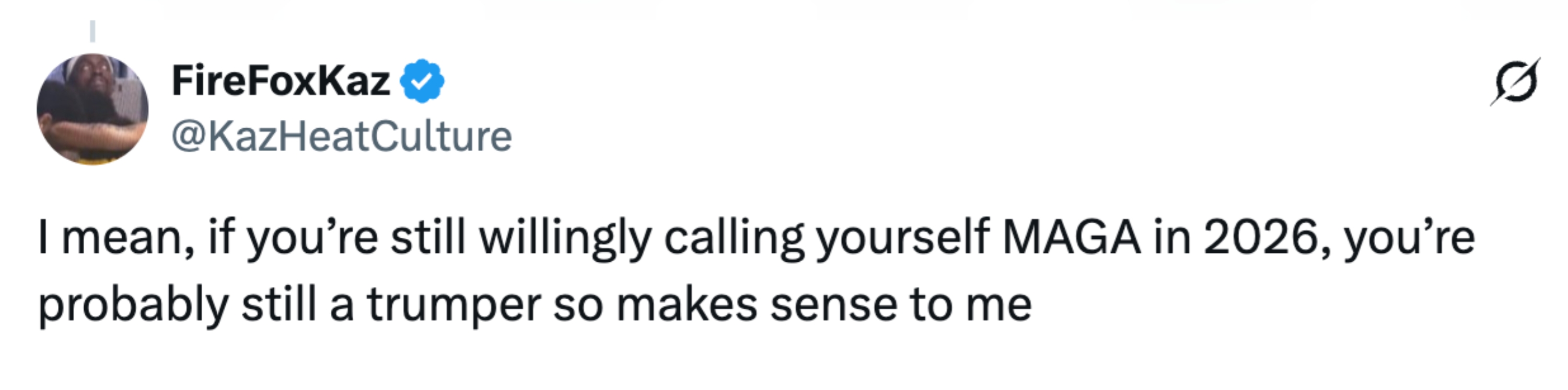 As a Resident Writer here at BuzzFeed, I cover topics like politics, weird history, tech, trending viral stories, and other various corners of the internet. (Always an interesting choice to re-share clips from a news station you're constantly chastising, but hey, what do I know?) "So that 100% that Donald Trump has among MAGA GOP, that is not an artifact of MAGA shrinking, it's just an indication of how strong Donald Trump's grip is on that MAGA base." There's no break in MAGA. Trump's approval with MAGA GOP is literally 100%.90% of MAGA GOP approve of US military action in Iran. Those who disapprove of Trump are not MAGA at this point. Importantly: MAGA makes up the same share of voters as it did when Trump won in 2024. pic.twitter.com/LqMRHm8t1B